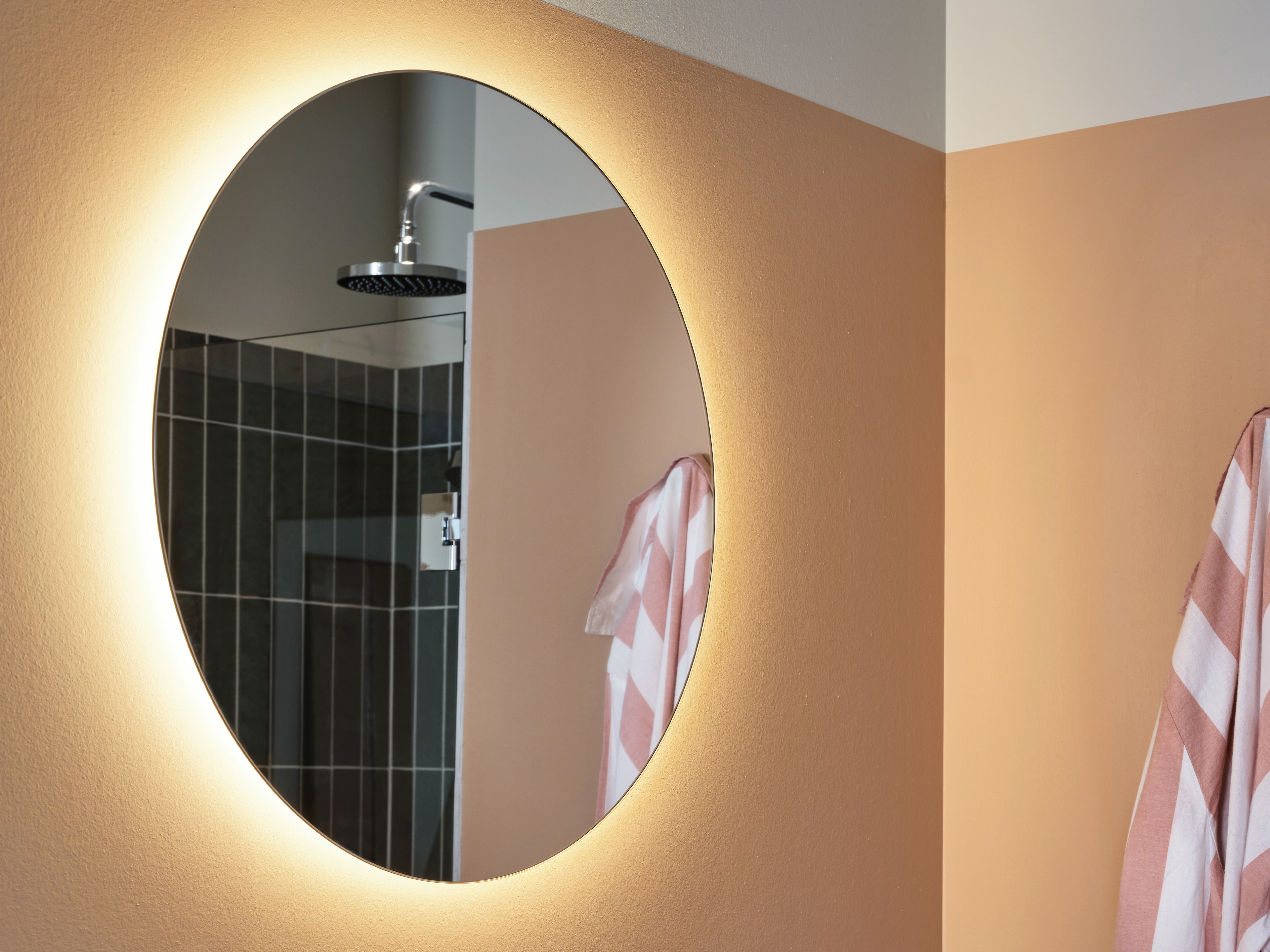 Spegel Säven är en rund spegel med LED-belysning som dekorljus.