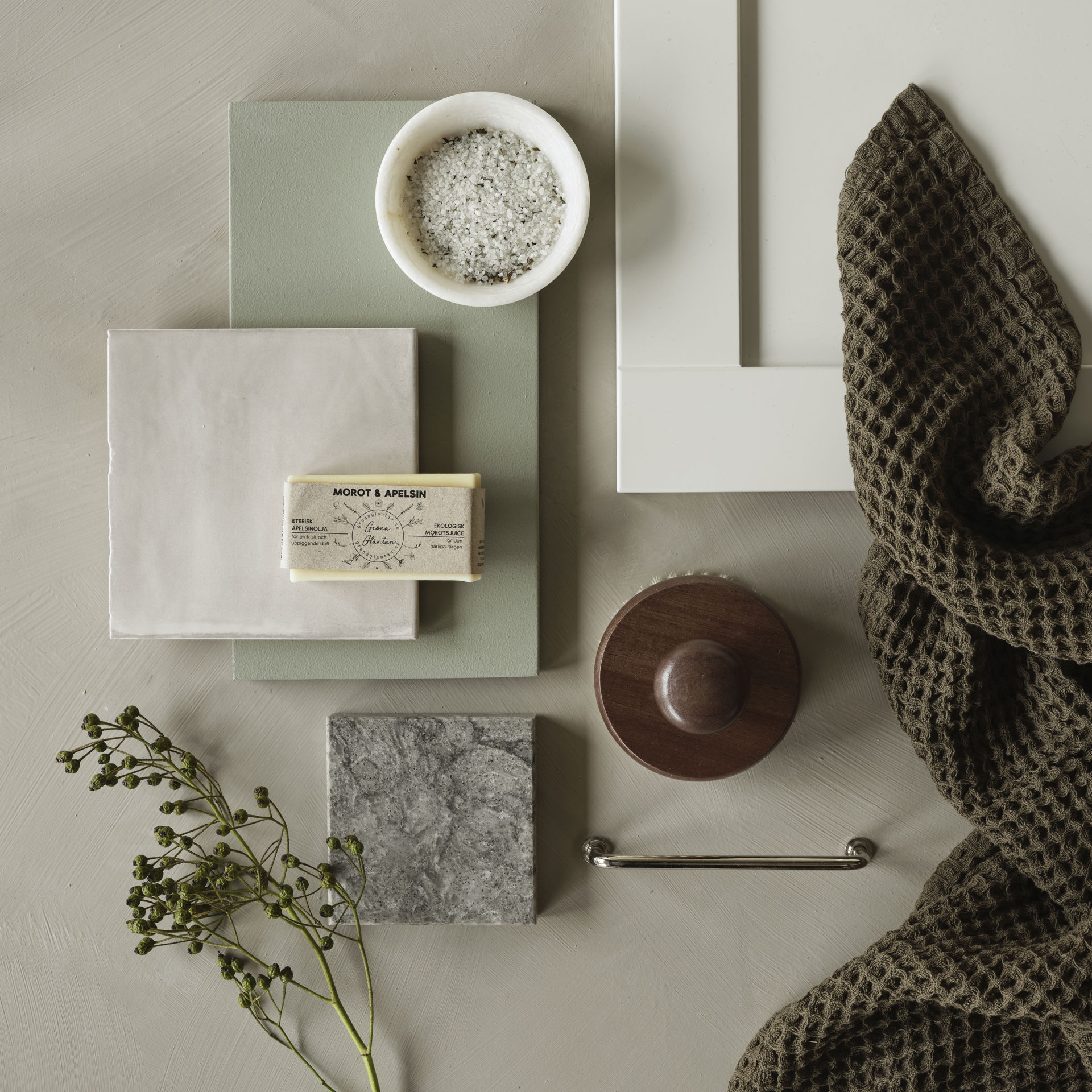 Ett tidlöst badrum som flörtar med det unga och samtida. Här skapar den starka möbelkänslan, dimgröna väggkulören och mötet mellan matta och blanka ytor en levande och varm fond till den klassiska stilen.