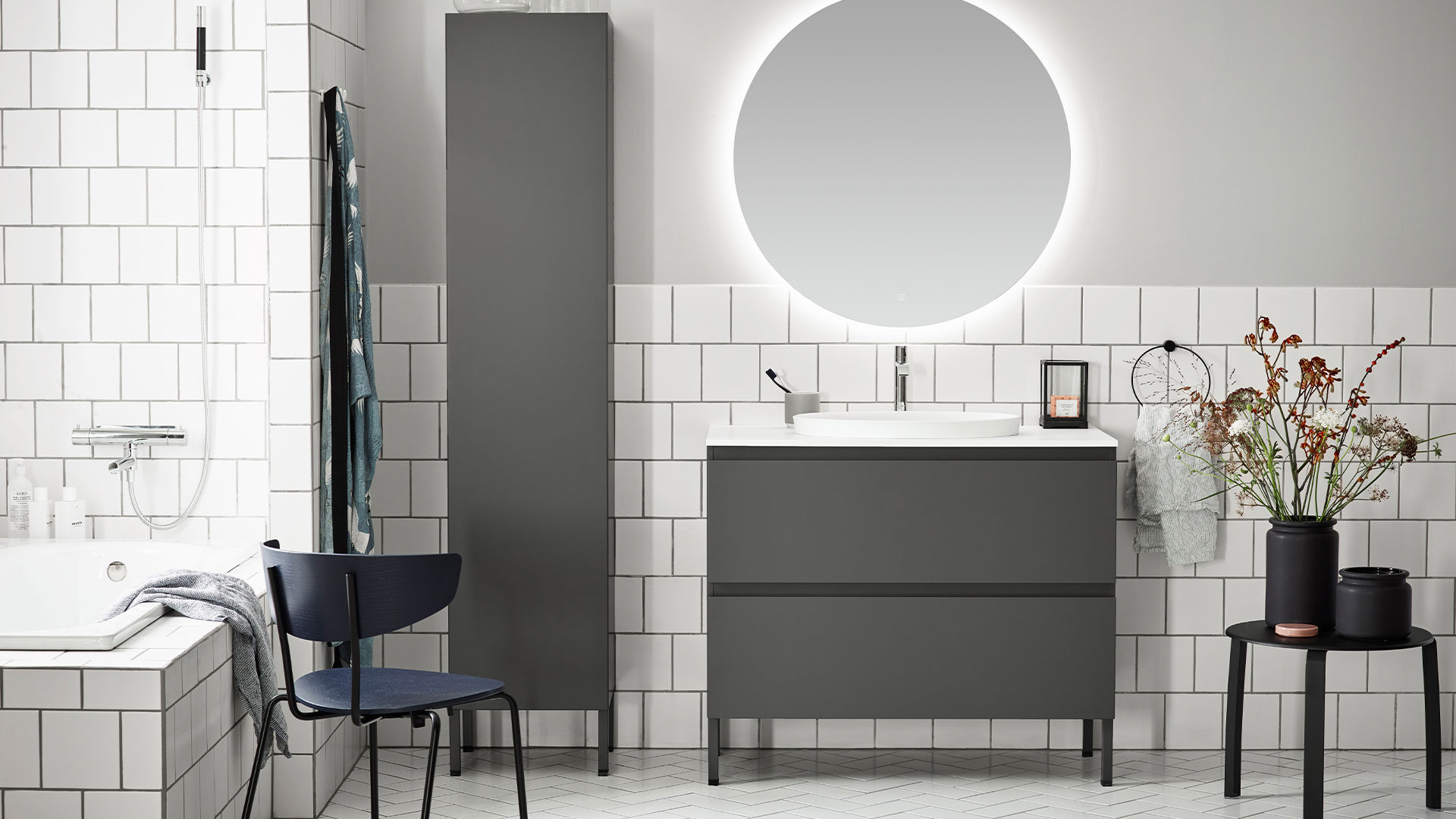 Ett badrum som är rymligt och luftigt, med högskåp och kommod som ger gott om förvaring för hela familjen. Den sobra färgsättningen skapar en lugn och harmonisk stämning, och den runda spegeln och halvkaklade väggen ger ett mjukt och varmt intryck. Mycket möbelkänsla i kombination med svala, industriella inslag.