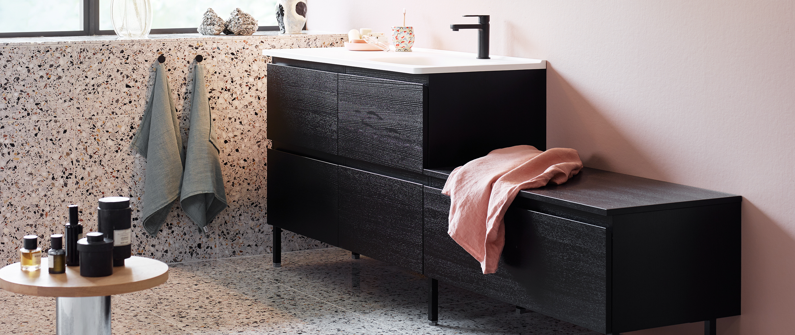 Ett rymligt badrum som ligger i anslutning till sovrum och dressingroom. Det har en genomgående färgsättning i naturnära skogsgrönt och linnebeige, tillsammans med ett ljust terrazzogolv. De stilrena linjerna har vi mjukat upp med en rund spegel och det taktila tvättstället Flow i Top Solid. Avställningsytor både på hylla och tvättställ och massor av förvaring i kommoden.