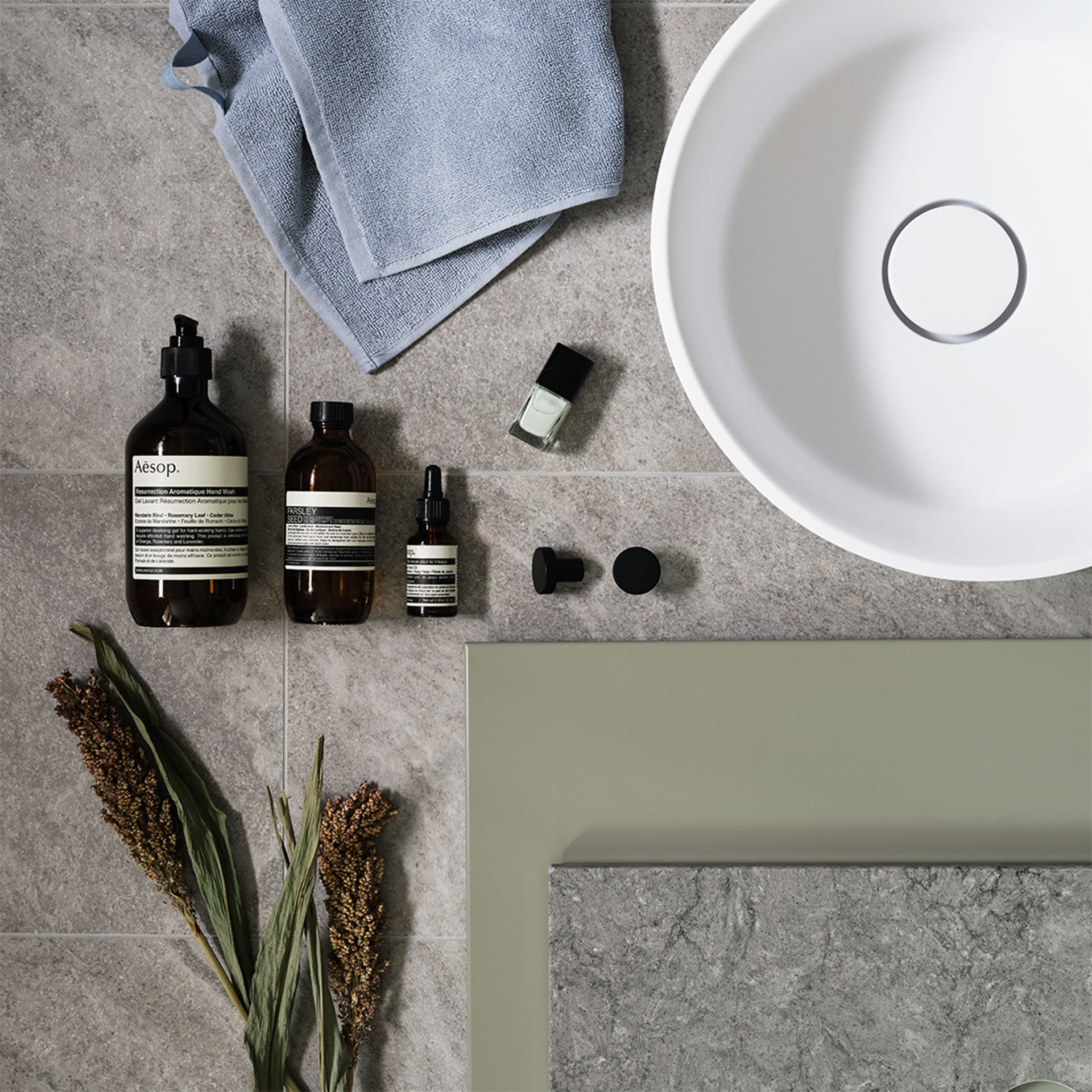 Ett ljust och luftigt badrum med en färgkombination där himmelsblått möter grönska. Den taktila topplattan i kompositstenen Turbine Grey passar fint till det seminedfällda tvättstället Zone. Här får du generösa avställningsytor vid handfatet, en stor rund spegel för att skapa extra rymd och luftighet i badrummet – och hyllor i svart metall som ger badrummet karaktär.