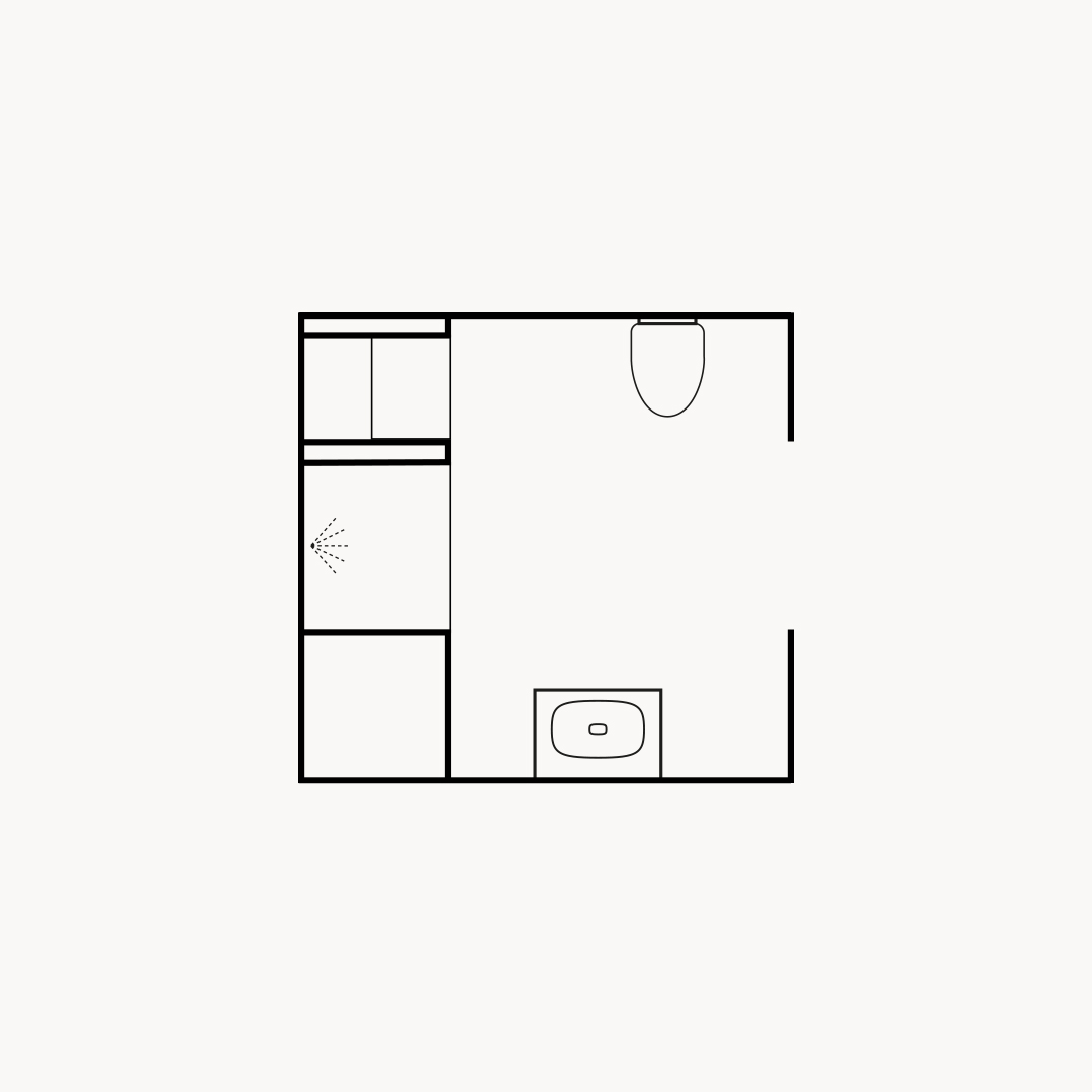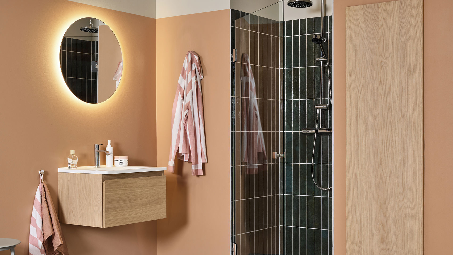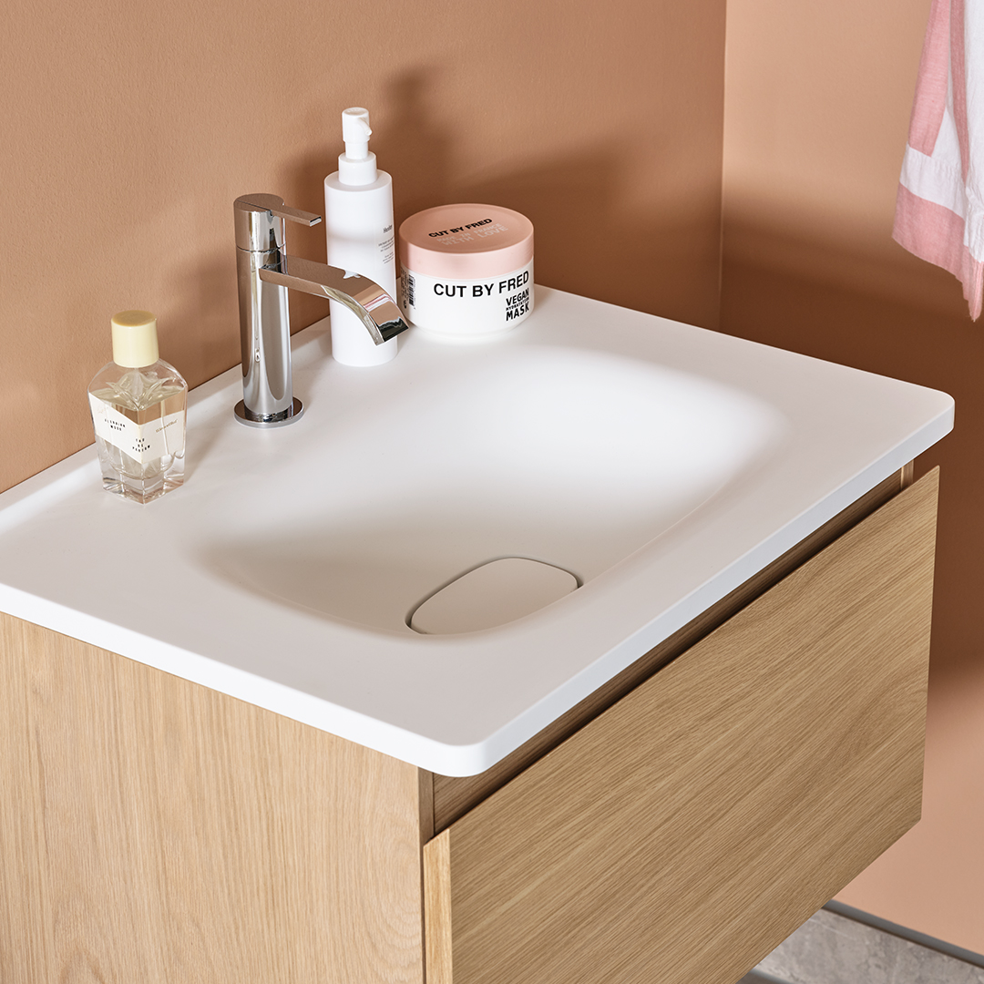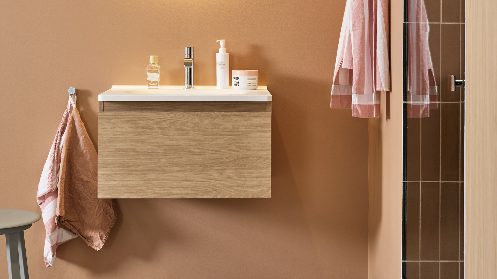 I det här badrummet har vi valt en Flow i bredden 600 mm i ett grundare utförande, utan att seriens rena linjer går förlorade. Den rosa tonen på väggarna och det gröna kaklet i duschen är en pigg kontrast till golvets stenuttryck och den vitpigmenterade ekens obehandlade träkänsla.