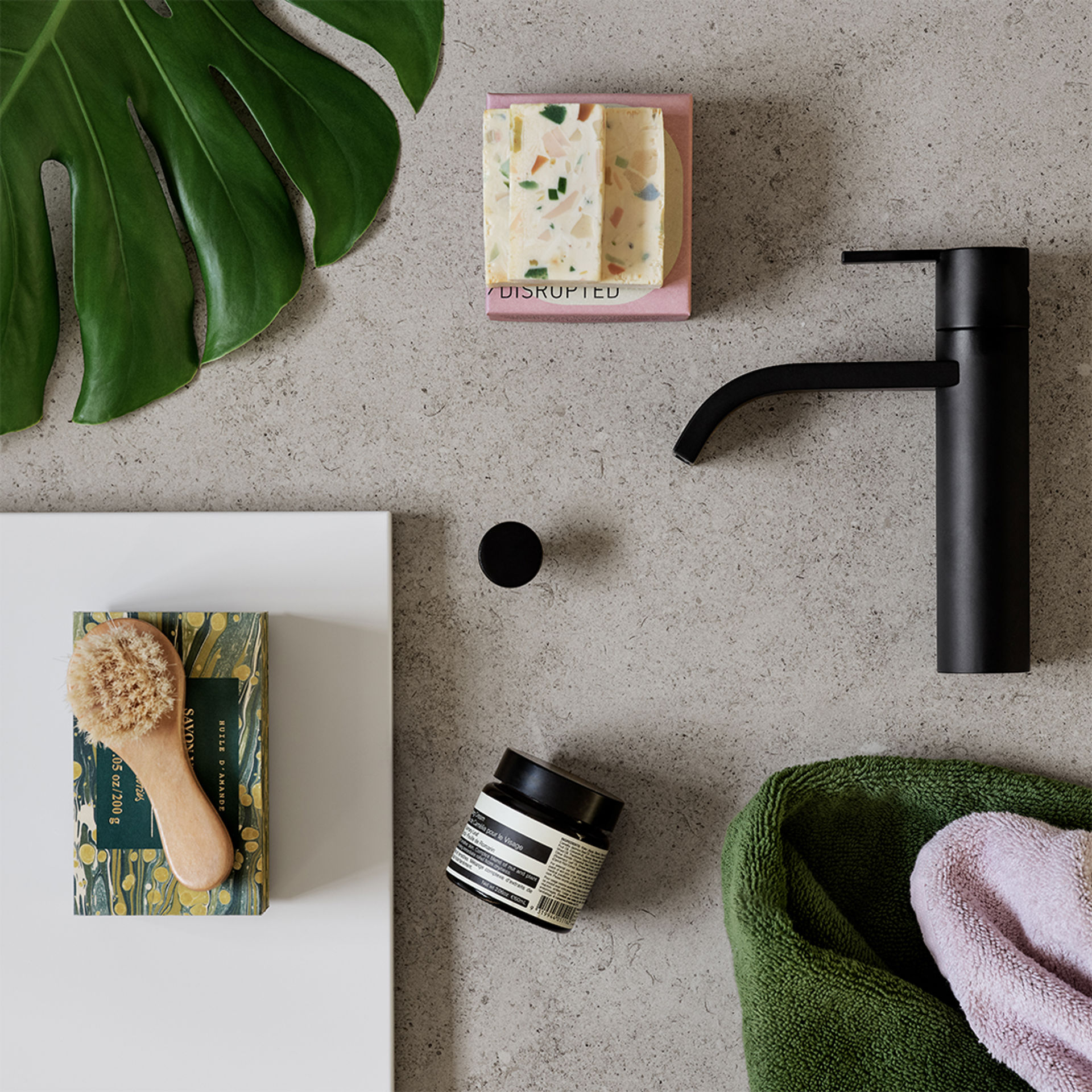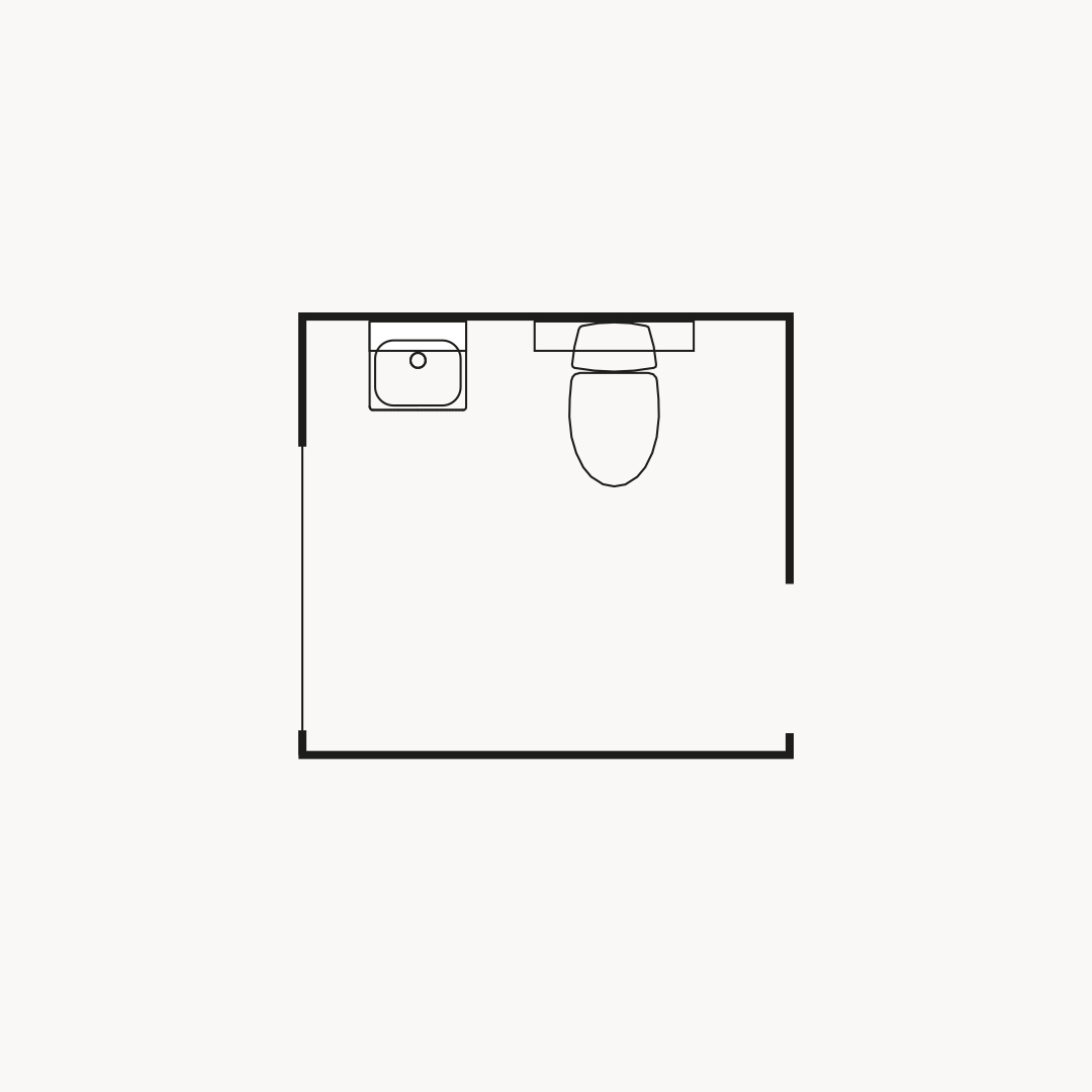 Här kombineras den minsta kommoden i serien Free med det nya, stilrena tvättstället Found. Den ljusa inredningen bryts av med svarta detaljer som ger rummet karaktär. De öppna hyllorna bjuder in till möjligheten att visa sådant man tycker om och använder ofta, medan annat döljs i spegelskåpet. Ett litet badrum med mycket personlighet.