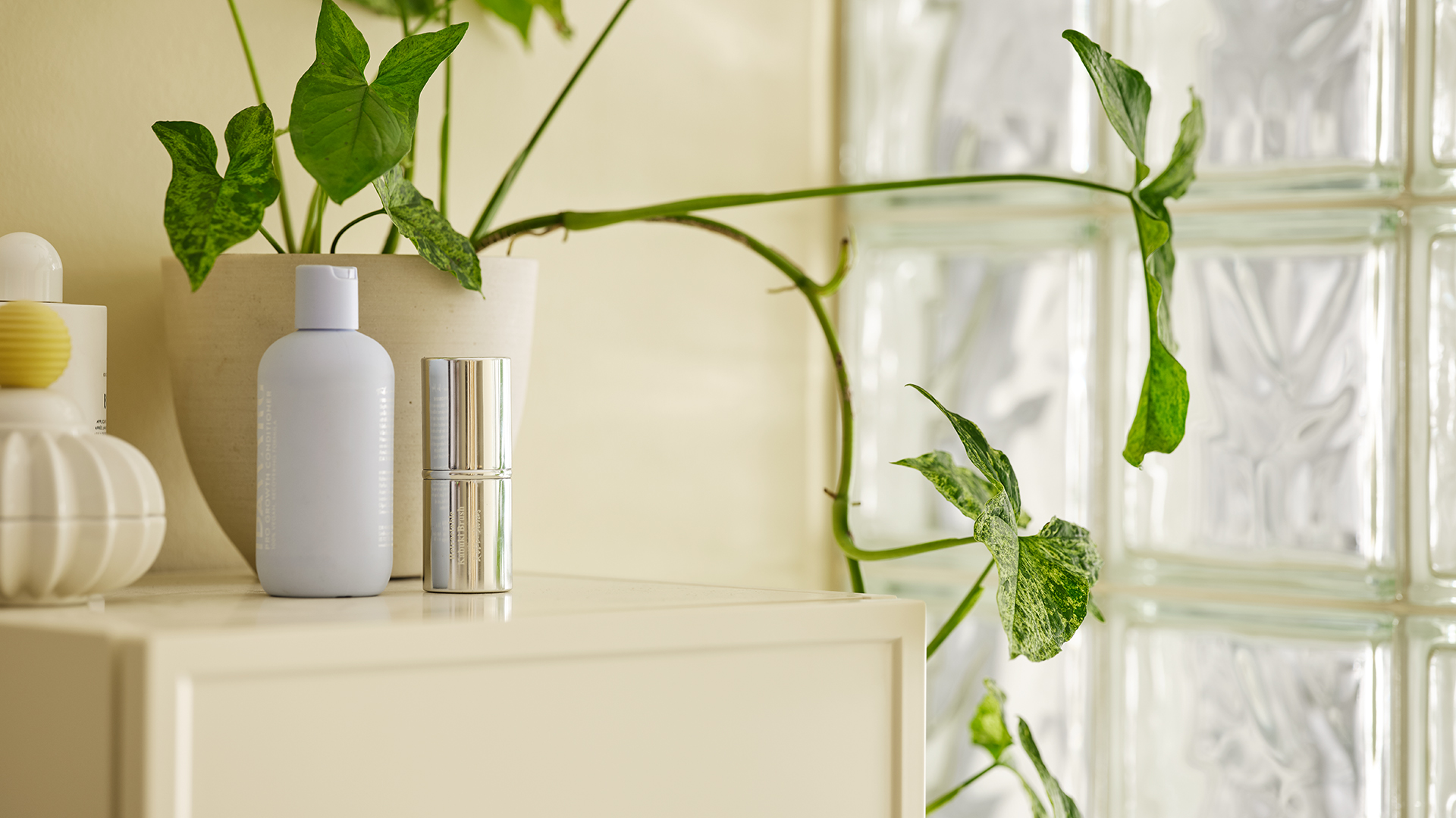 Ett luftigt och soligt badrum med eleganta former och robust natursten.