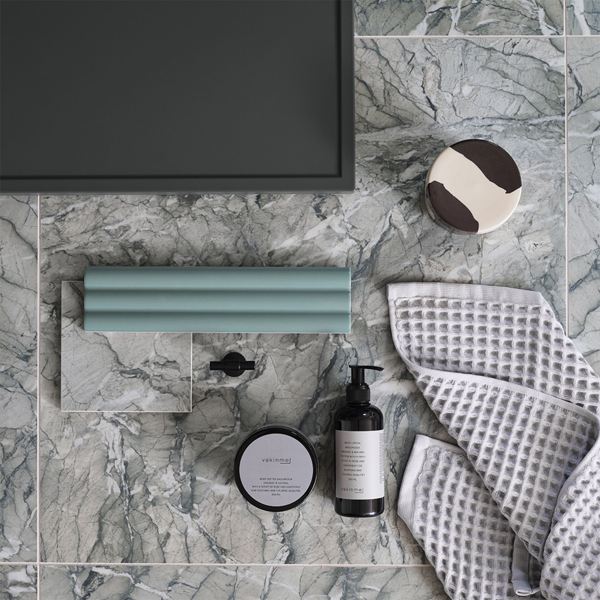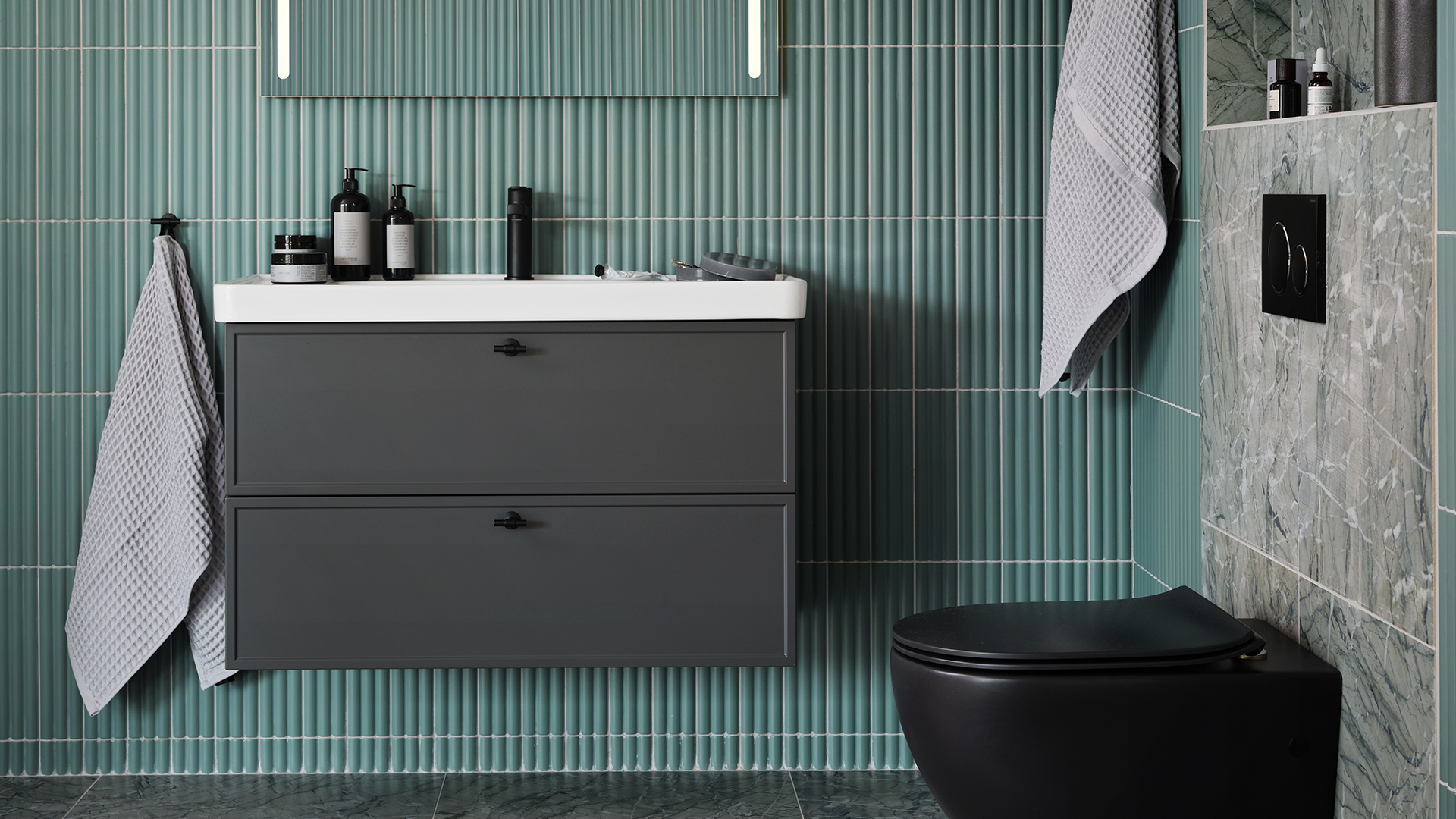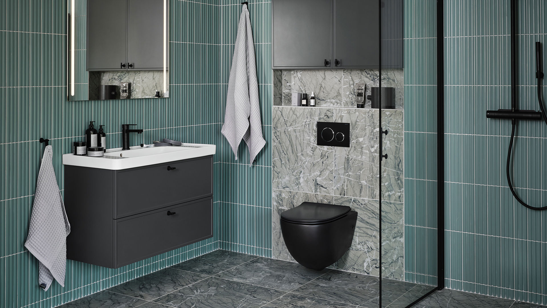 Ett badrum i turkosgröna toner där den smala ramen och nya kulören mörkgrå på luckan Thea skapar ett sobert uttryck. Den nya spegeln Lövsen med integrerad LED-belysning och svarta detaljer som den nya T-knoppen Tibast förstärker den stilrena känslan.