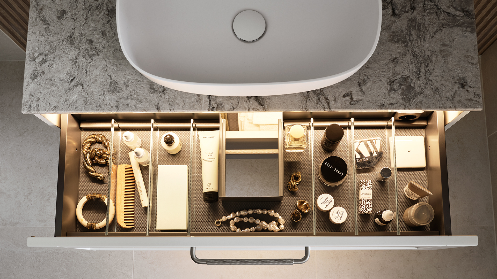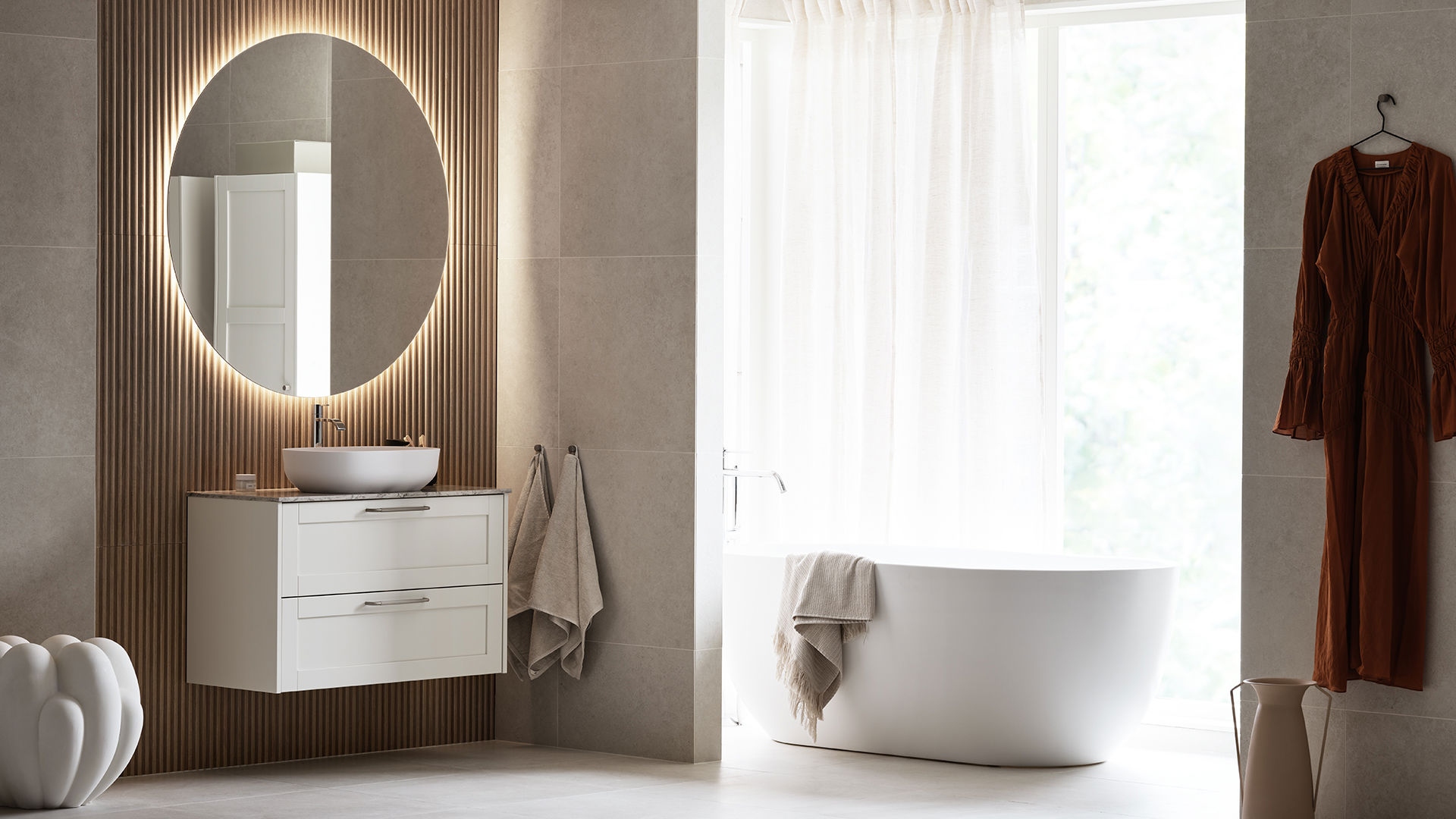 Här har vi skapat en luftig miljö som inbjuder till både rörelse och vila för kropp och sinne. Taktila material som topplattan i kompositsten, ljusa naturnära färger och rum i rummet ger en lyxig känsla. Den runda spegeln Mjörn förstärker uttrycket och högskåpen har generösa förvaringsmöjligheter. Den klassiska ramluckan Edit i kombination med Frame gör att badrummet känns tidlöst och samtidigt modernt.