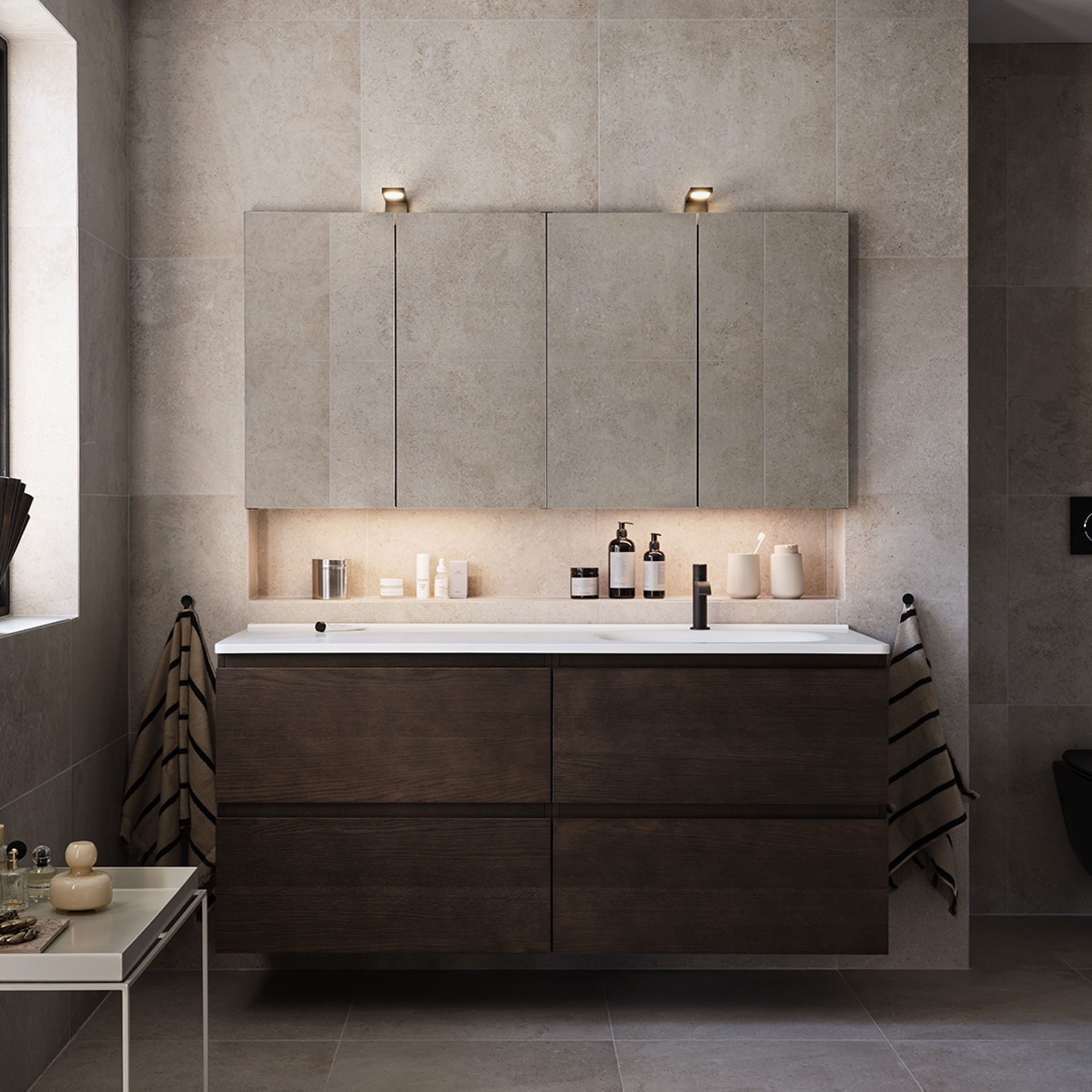 Komplett badrum med genomtänkta detaljer.