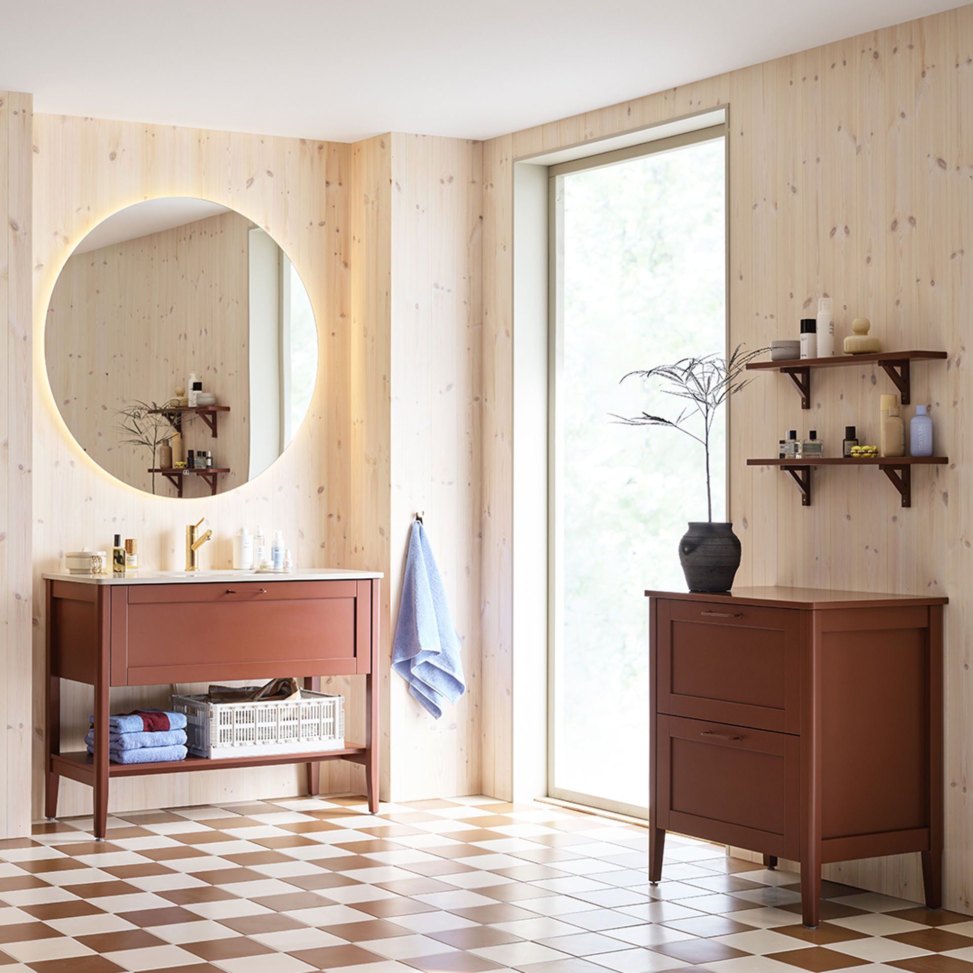 Badrum i naturliga kulörer och material. Här finns kopplingar till det lantliga med rustika uttryck och en känsla av hantverk och tradition. För dig som vill ha fina detaljer, tidlösa färger och en traditionell känsla.