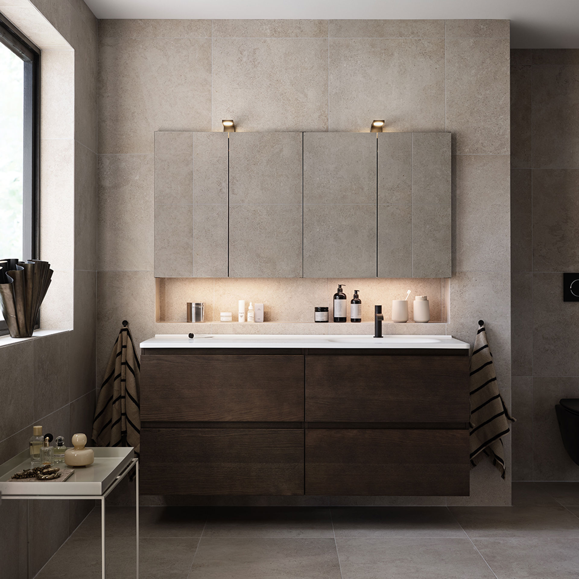 Avskalade och tydliga badrum i ljusa färger, naturmaterial och mjuka, organiskt rundade former. Smarta kombinationer mellan funktion och form. För dig som vill ha enkelhet, funktion och en naturnära känsla.