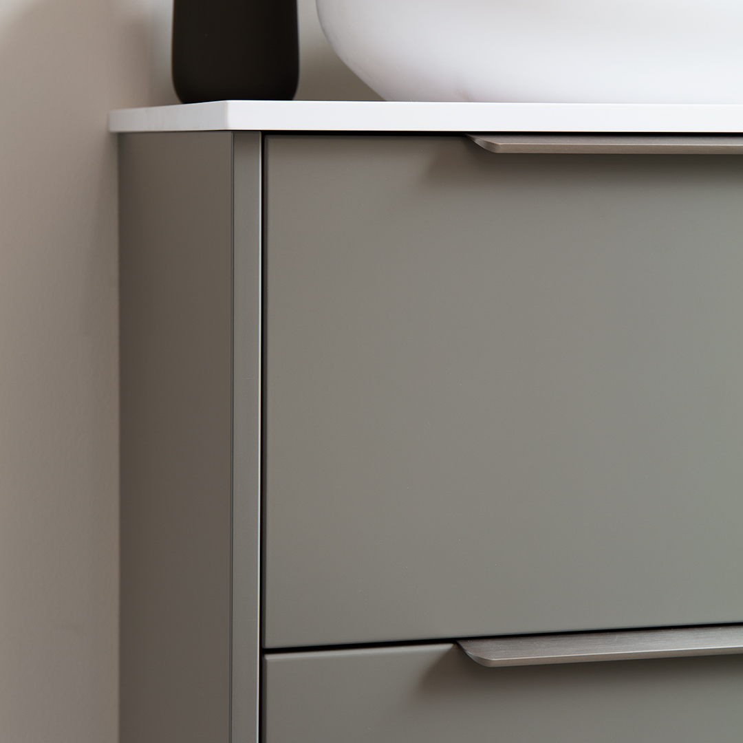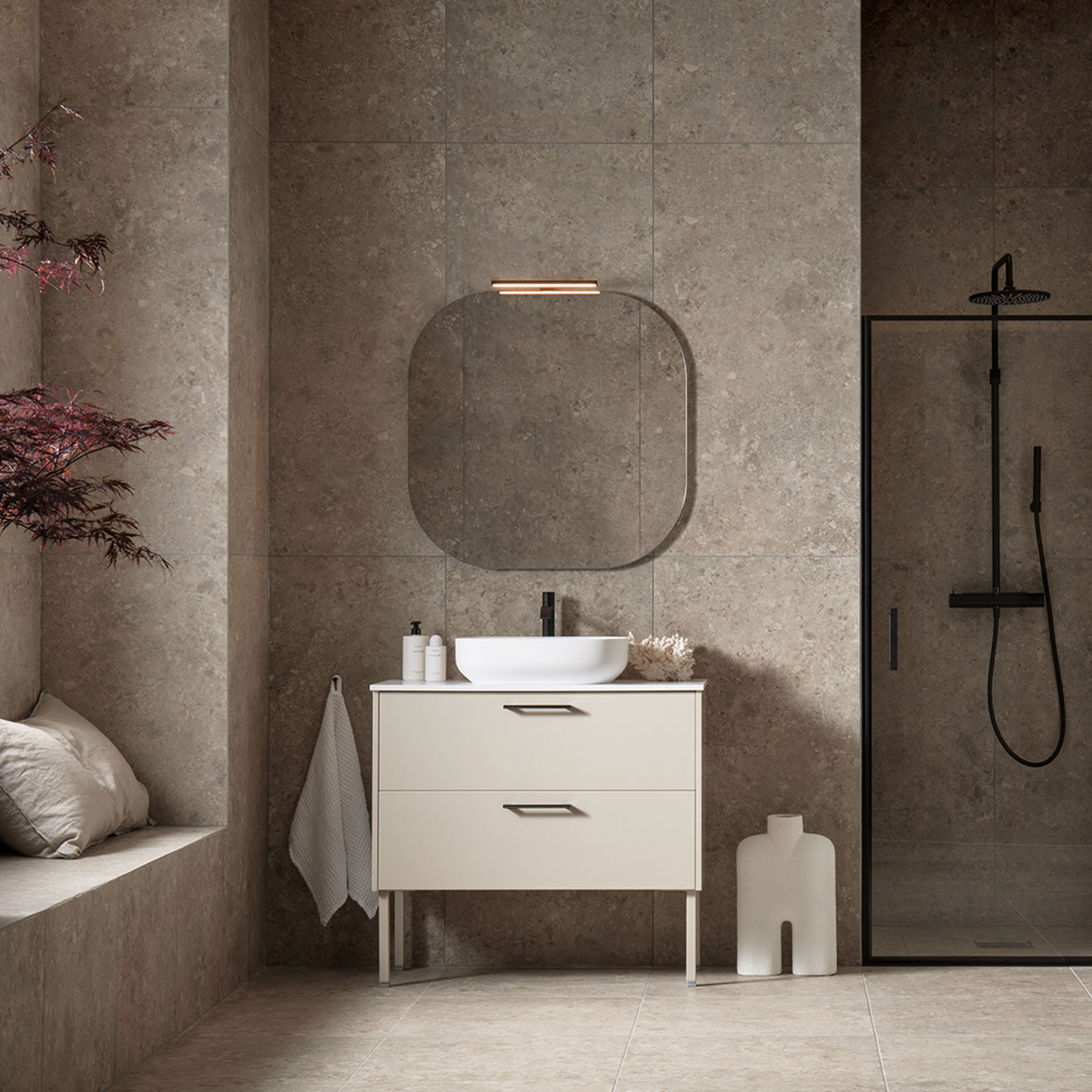 Luckan Moa har ett avskalat formspråk med enkla, rena linjer som skapar utrymme för olika stilval. Den målade släta luckan har en svagt rundad kant som ger ett mjukt uttryck. Passar dig som vill ha ett badrum med en enkel och tydlig känsla.
