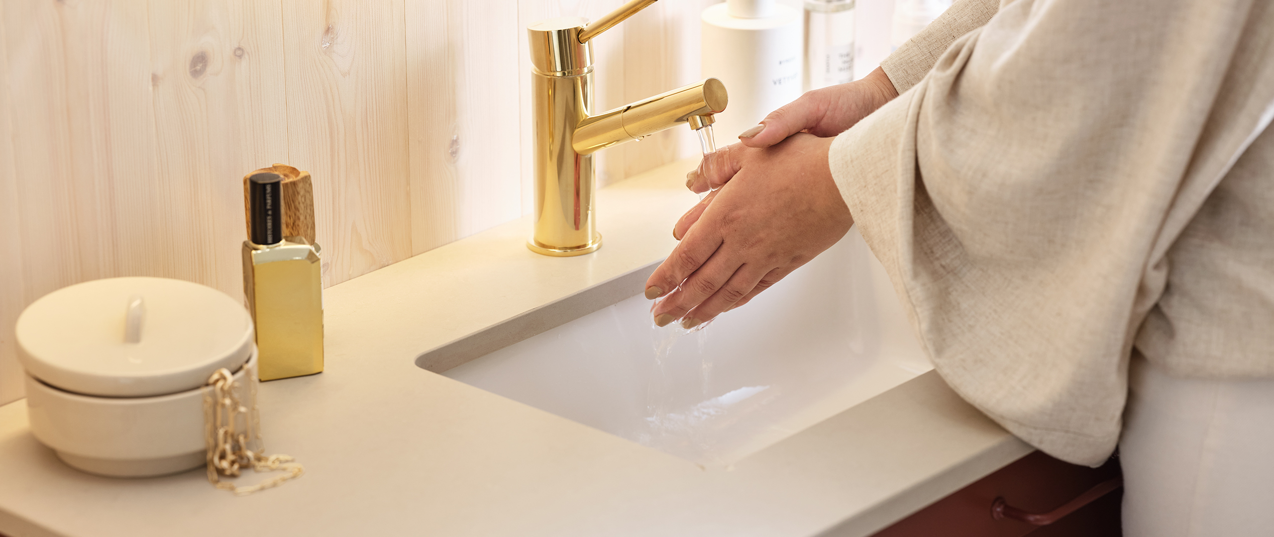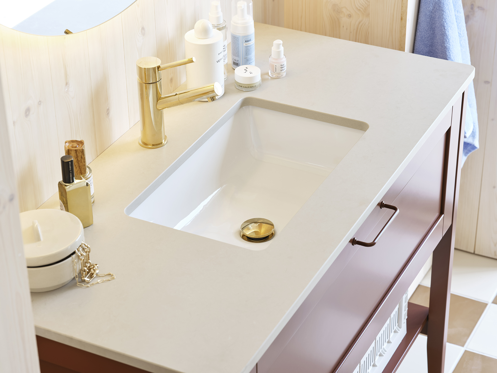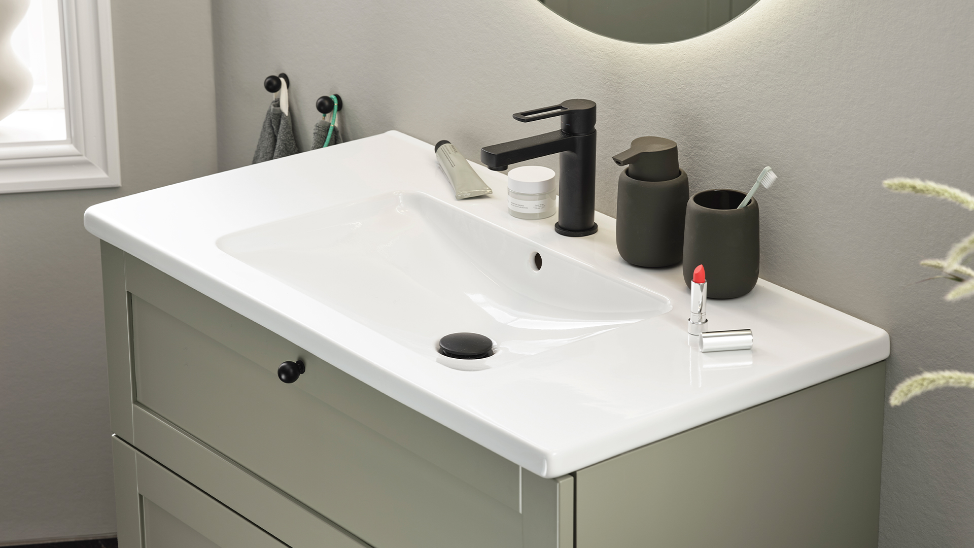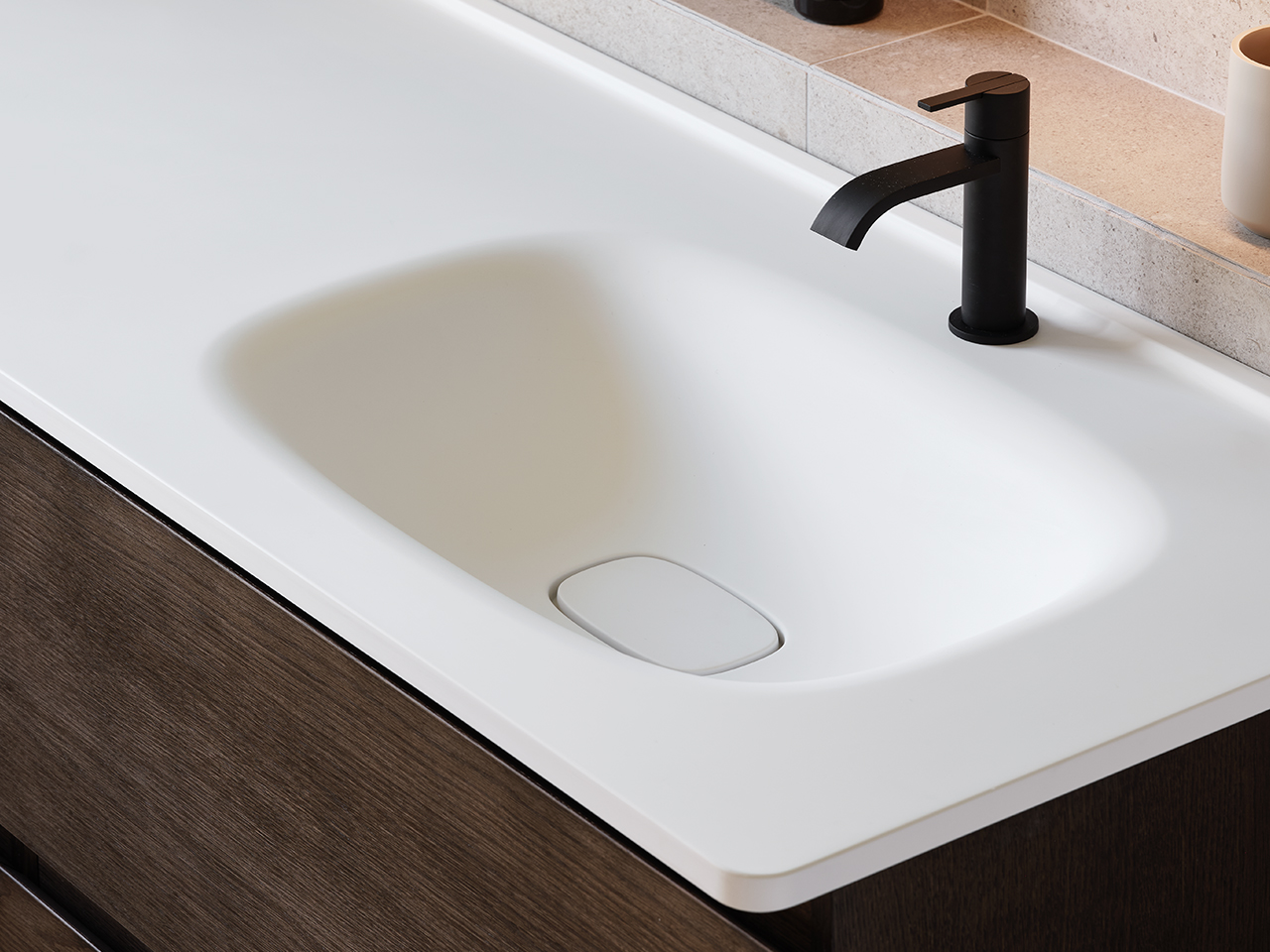 Ett seminedfällt tvättställ i Solid Surface med topplatta i Solid Surface, kompositstenen Moorland Fog eller Turbine Grey. Tvättstället finns i ovalt eller runt utförande. Passar till serie Flow.