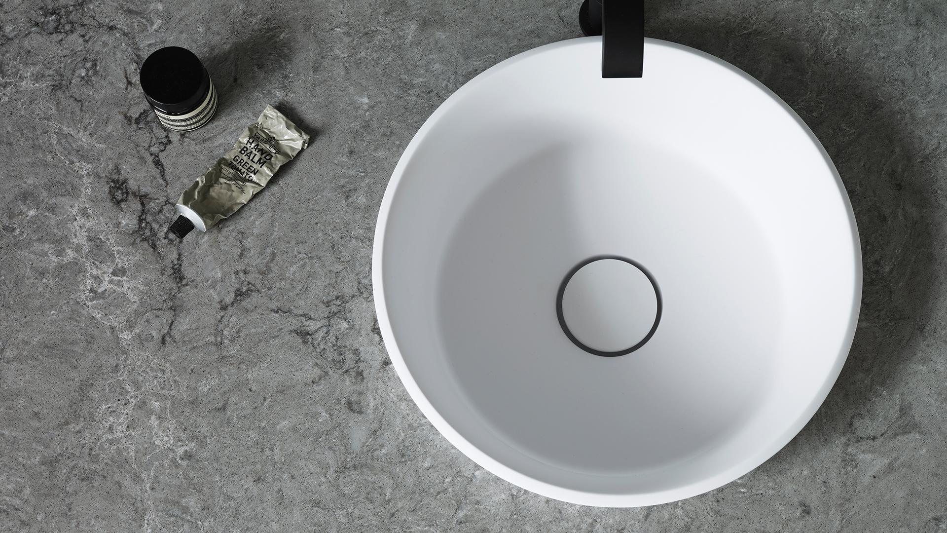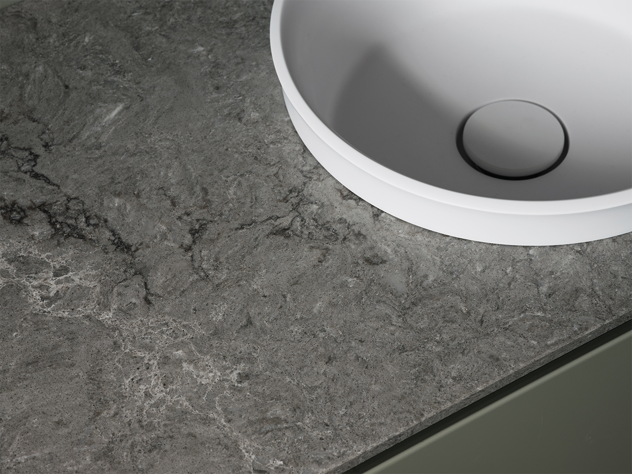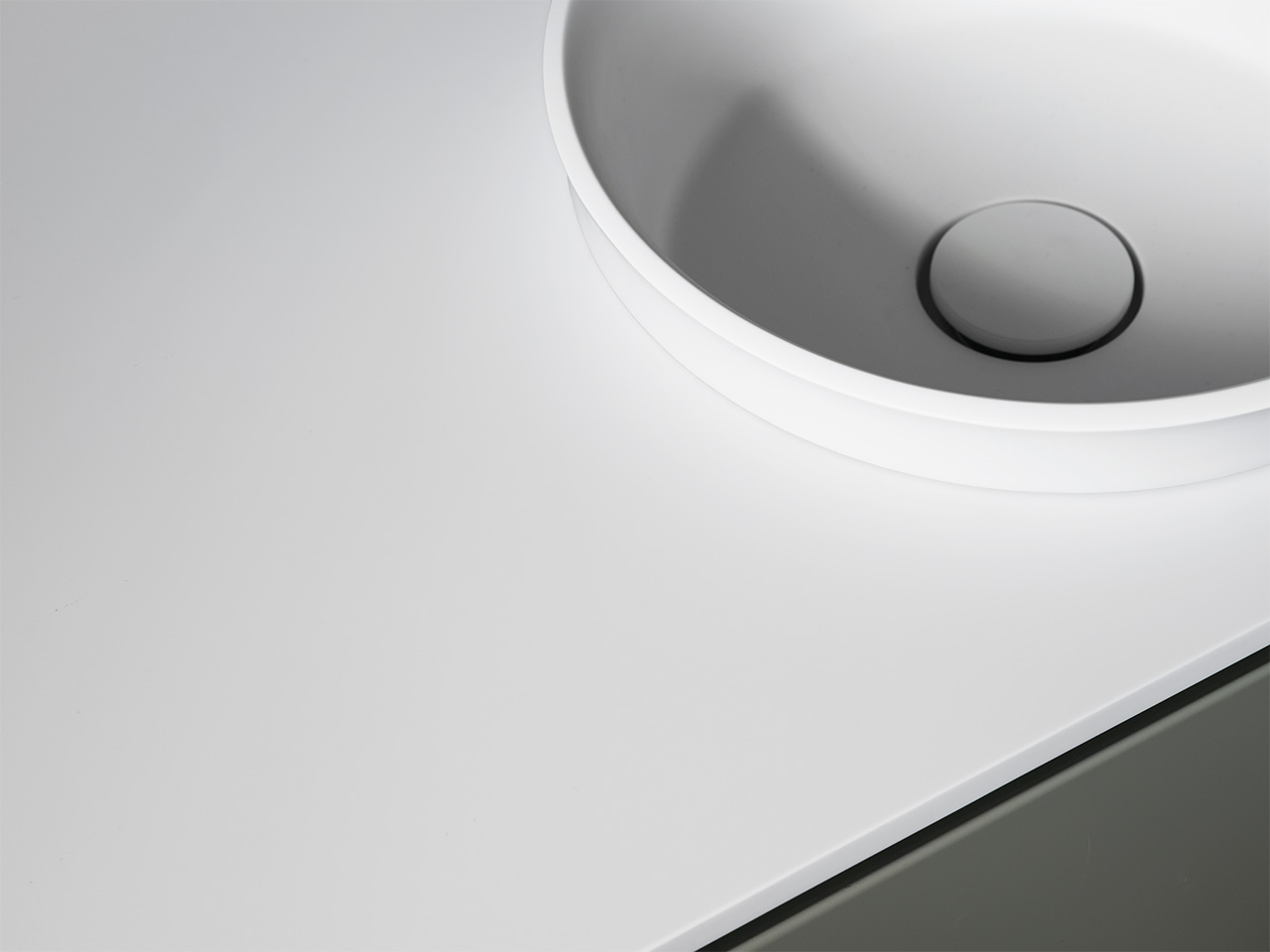 • Ett seminedfällt tvättställ i Solid Surface med topplatta i Solid Surface, kompositstenen Moorland Fog eller Turbine Grey. Tvättstället finns i ovalt eller runt utförande och levereras löst för montering i topplatta.