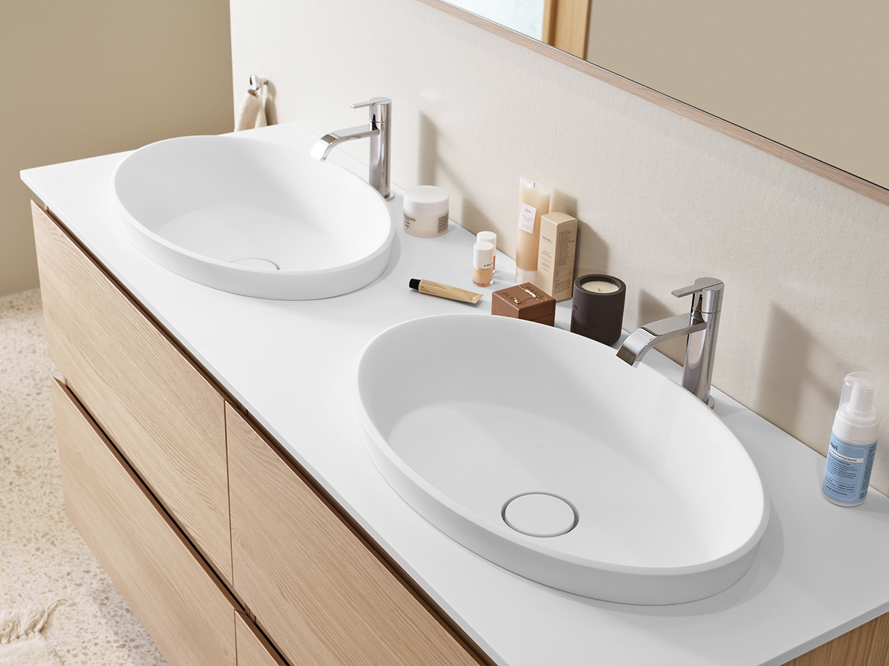 Det seminedfällda tvättstället Zone i Solid Surface finns i oval eller rund form. Välj topplatta i Solid Surface eller någon av kompositstenarna Moorland Fog och Turbine Grey för att få det uttryck du vill.