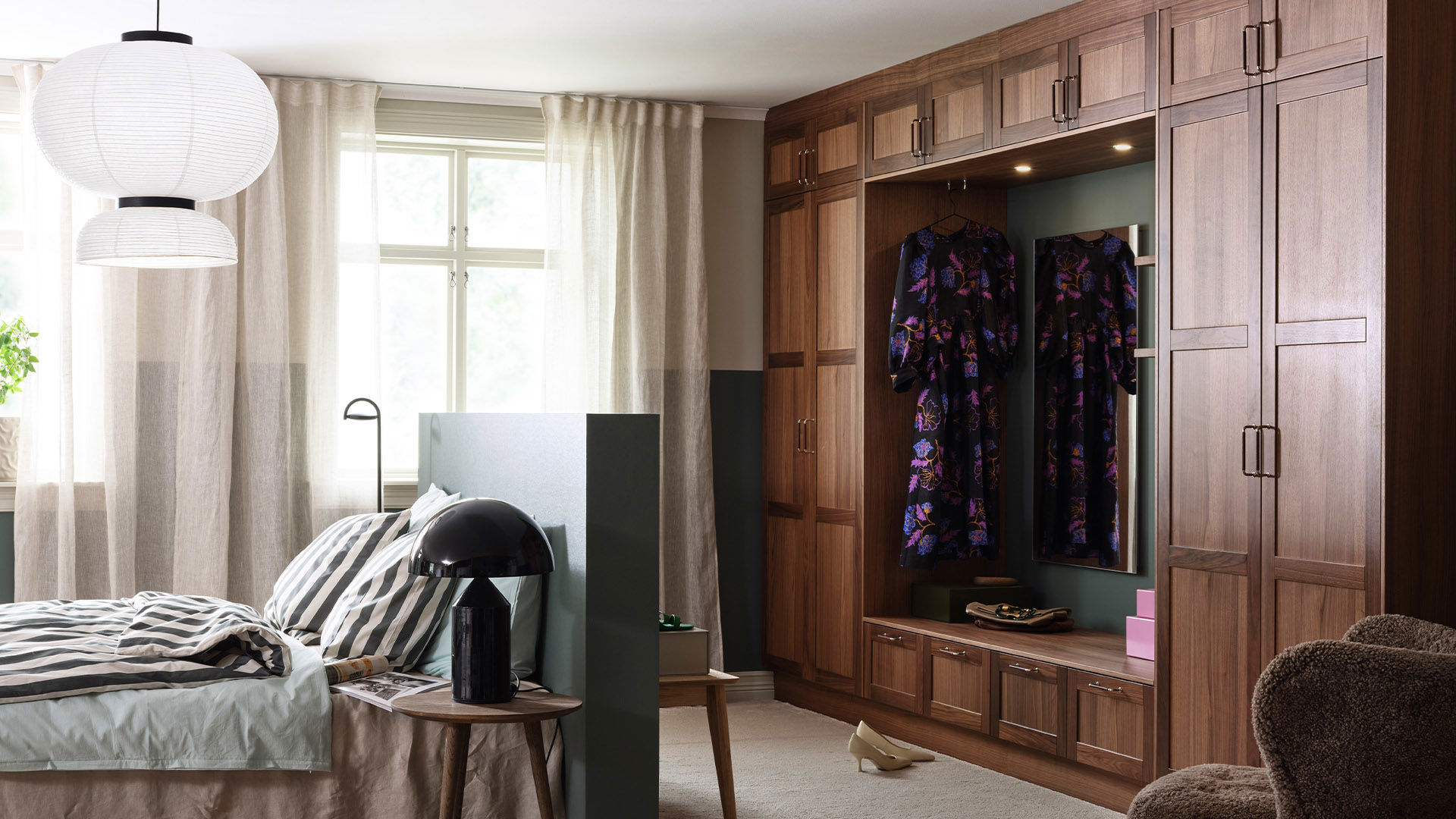 Varmt, ombonat, lyxigt – och ändå funktionellt. Luckan Ester i valnöt används här för att skapa ett dressingroom som är något utöver det vanliga. Massor av förvaring och praktiska lösningar som belysning över spegel, sittbänk och halvhög vägg/huvudgavel som skapar rum-i-rummet utan att störa det öppna intrycket. Hotellkänsla fast ni är hemma.