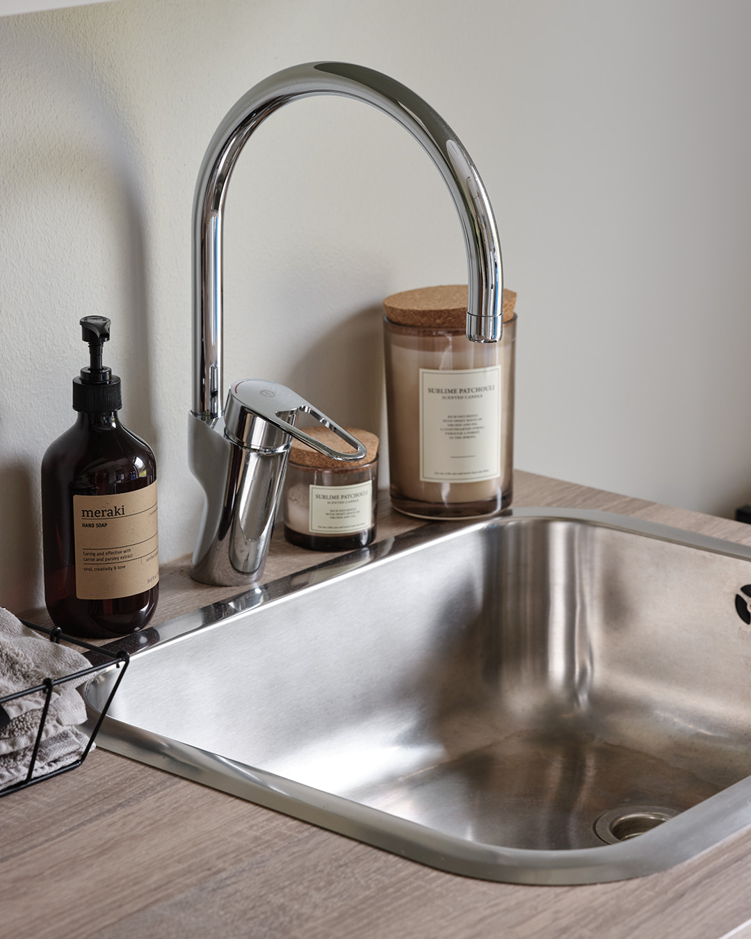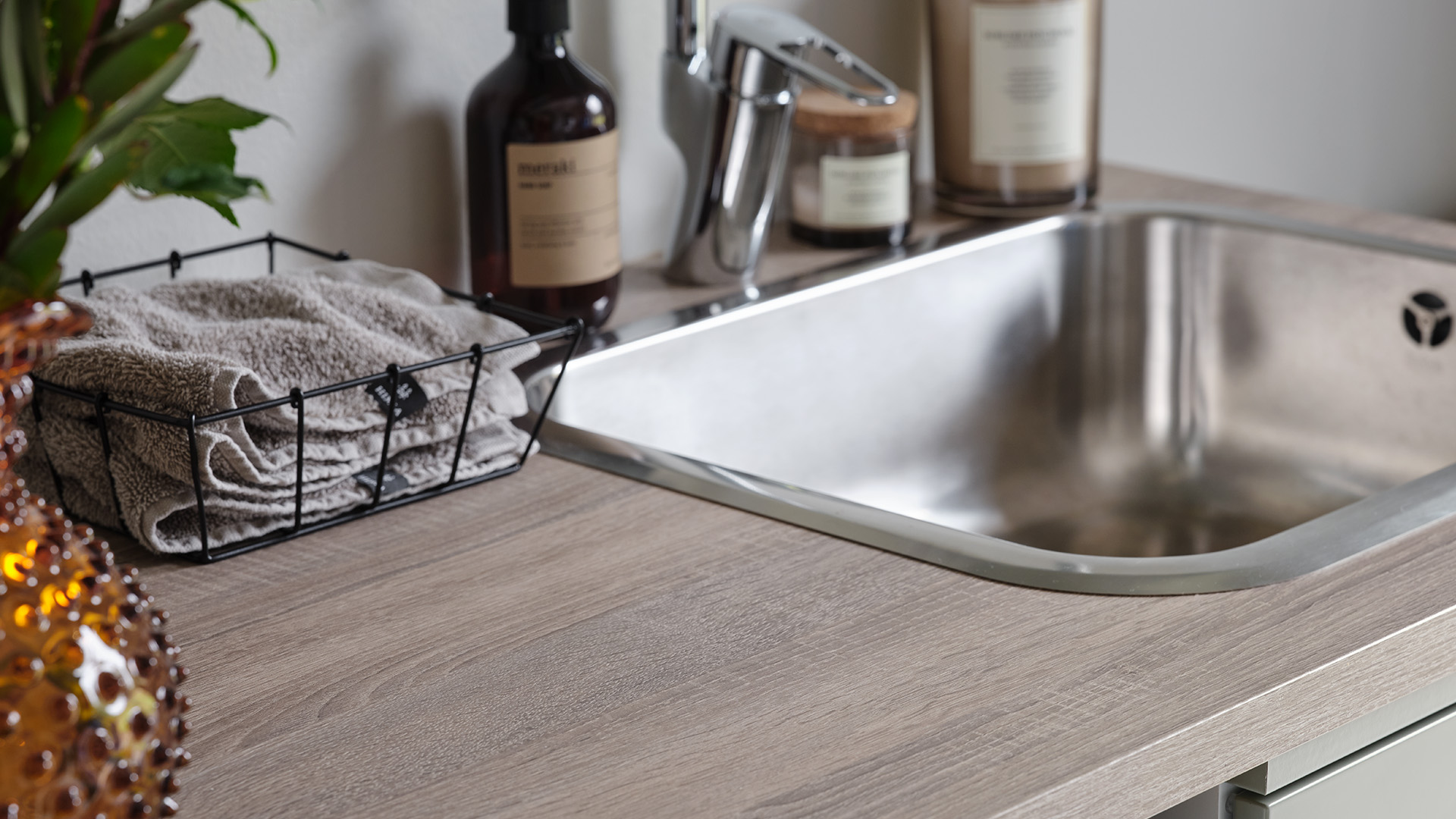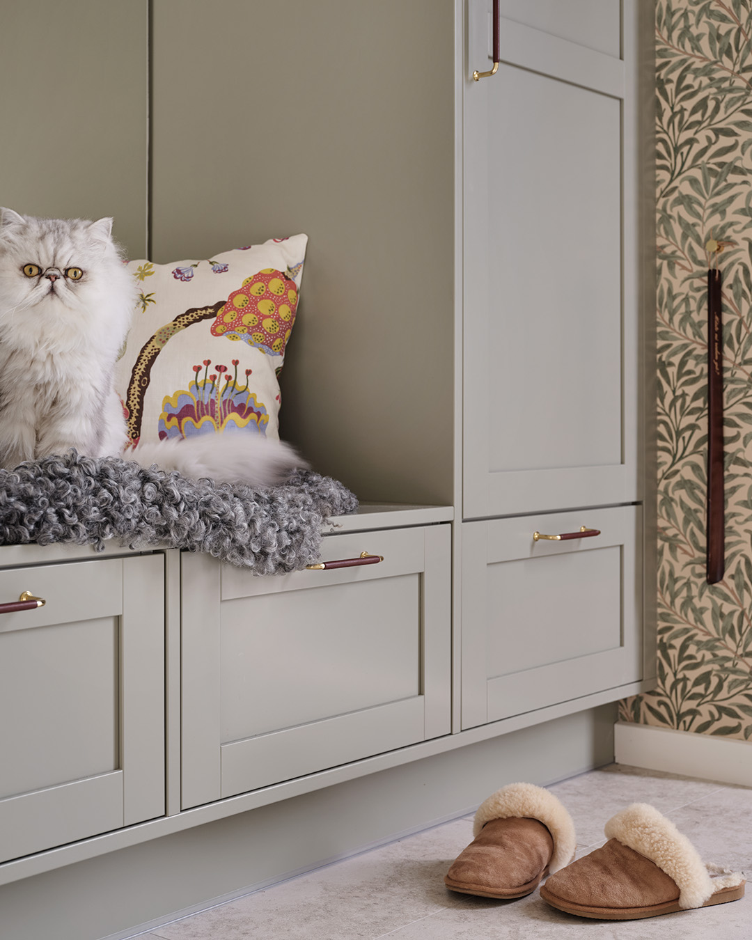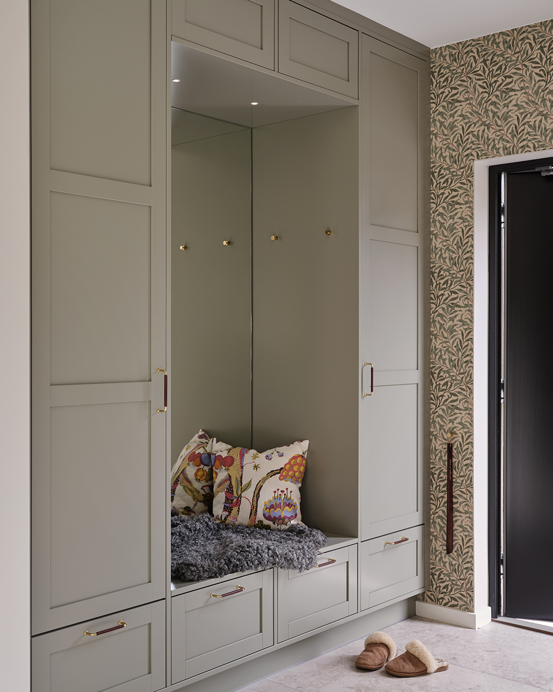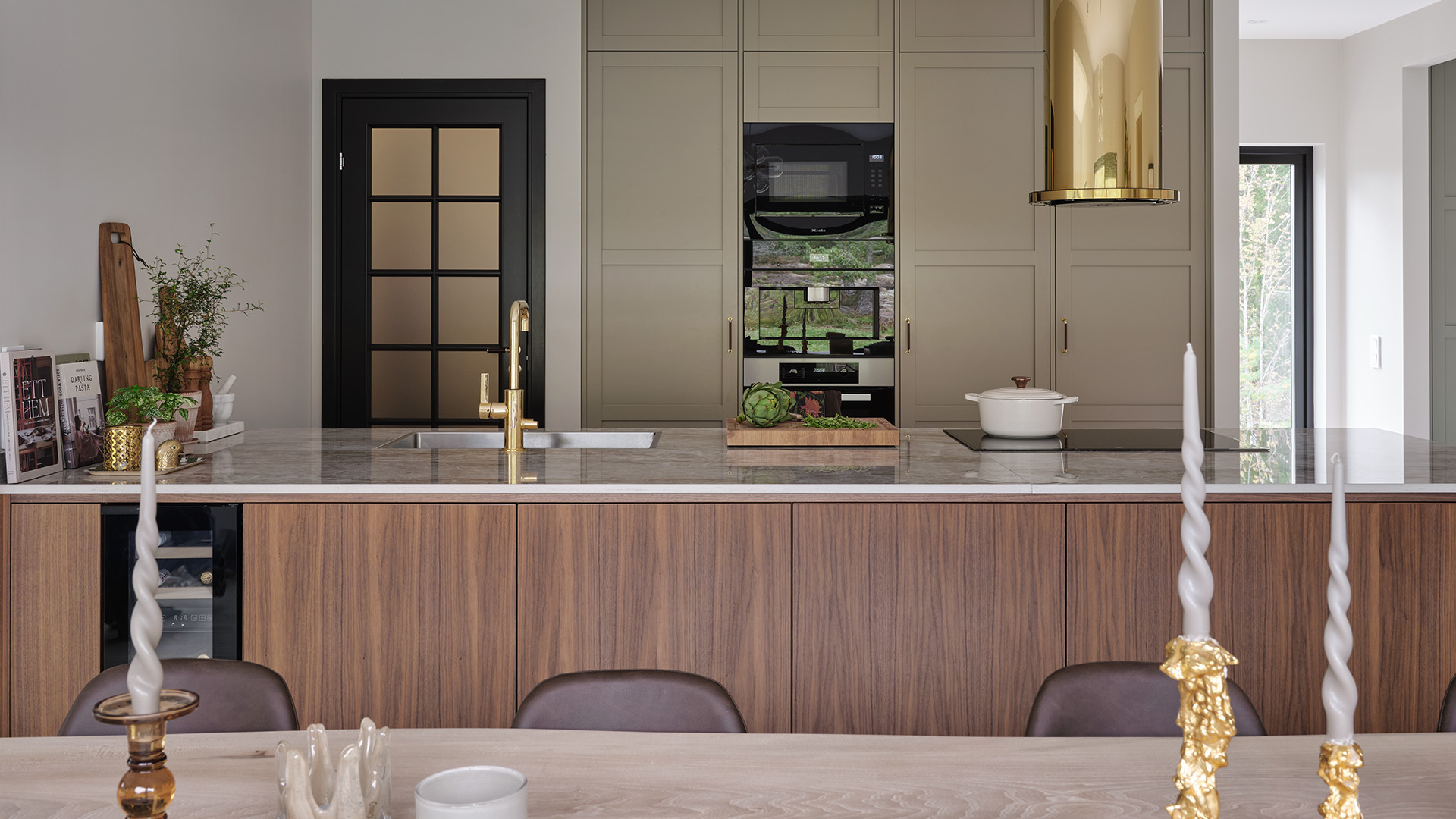 Under hela processen har det också varit viktigt att skapa en närhet mellan inne och ute, och sudda ut den gränsen. Omgivningen har haft stor inverkan på materialvalen och förutom köket i valnöt och sandbeige så har paret valt kulören dimgrön på sin Veduminredning i både hall och tvättstuga. En harmonisk kulör med inspiration från naturen.