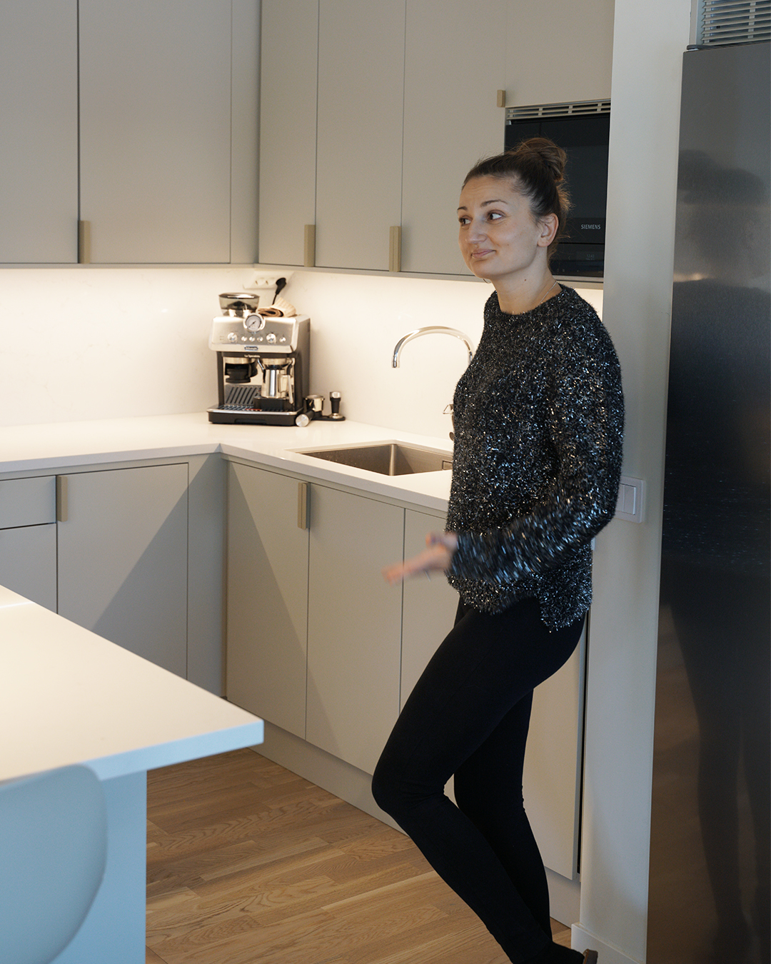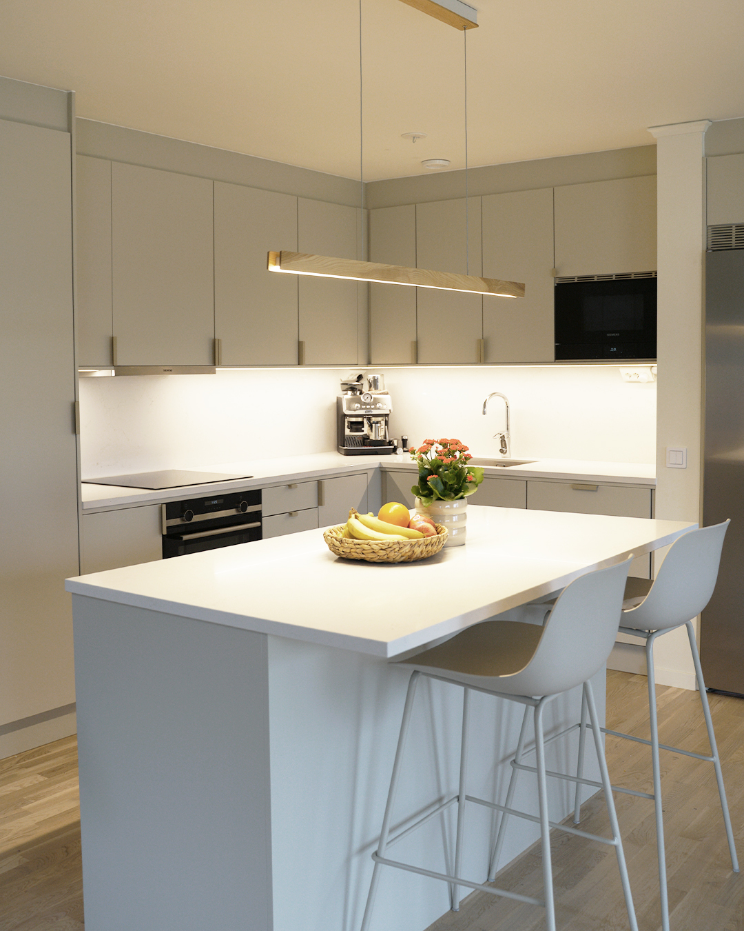 – Den infrästa belysningen under överskåpen är verkligen en favorit. Det ger ett fantastiskt ljus och vi kan justera ljusstyrkan genom att dimma den, vilket gör det både praktiskt och stämningsfullt, säger Emilia.
