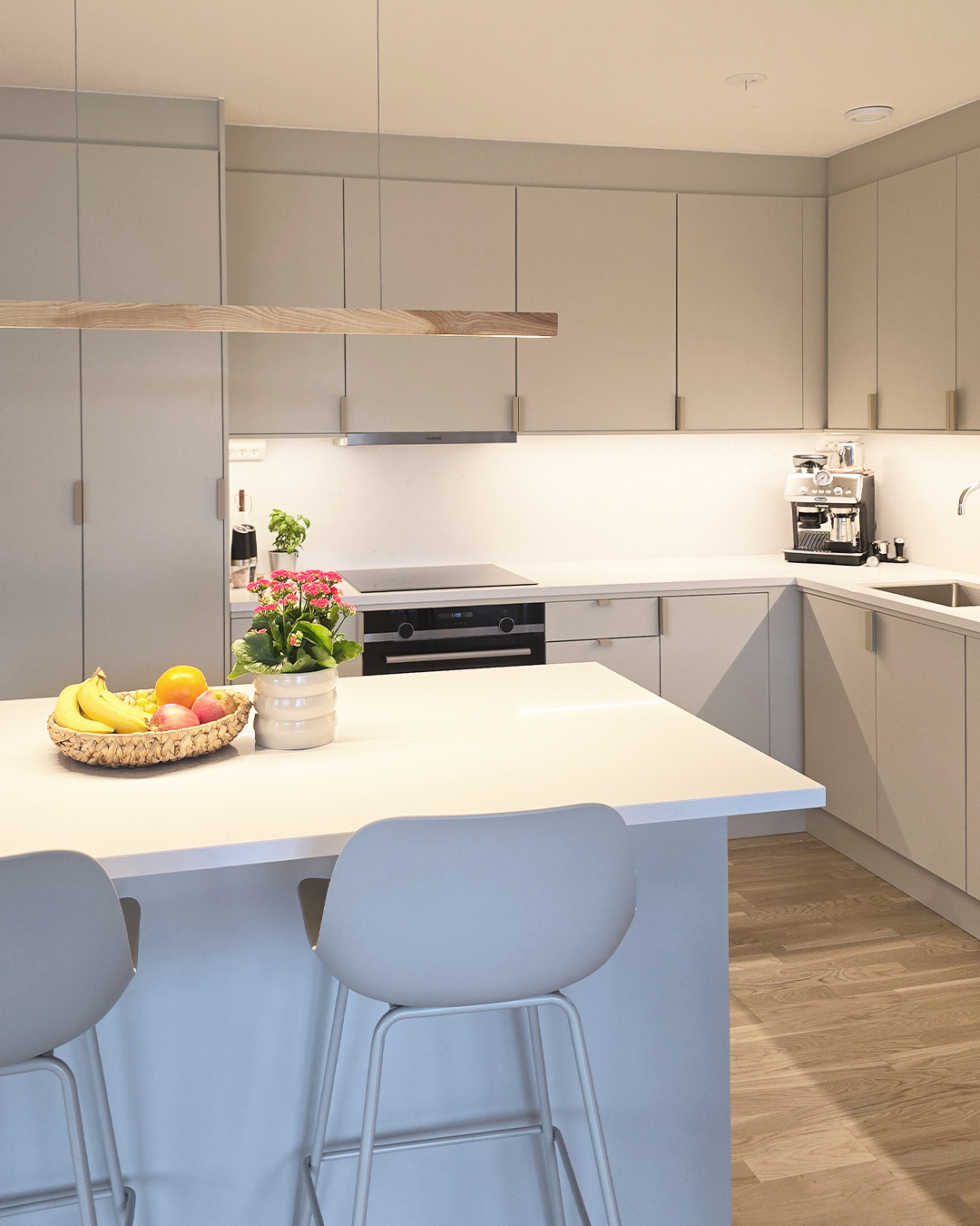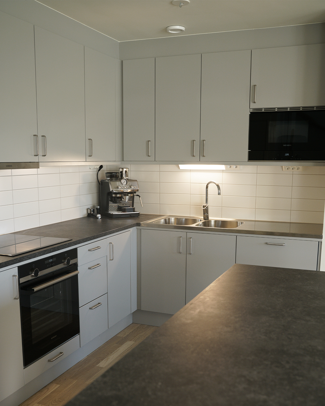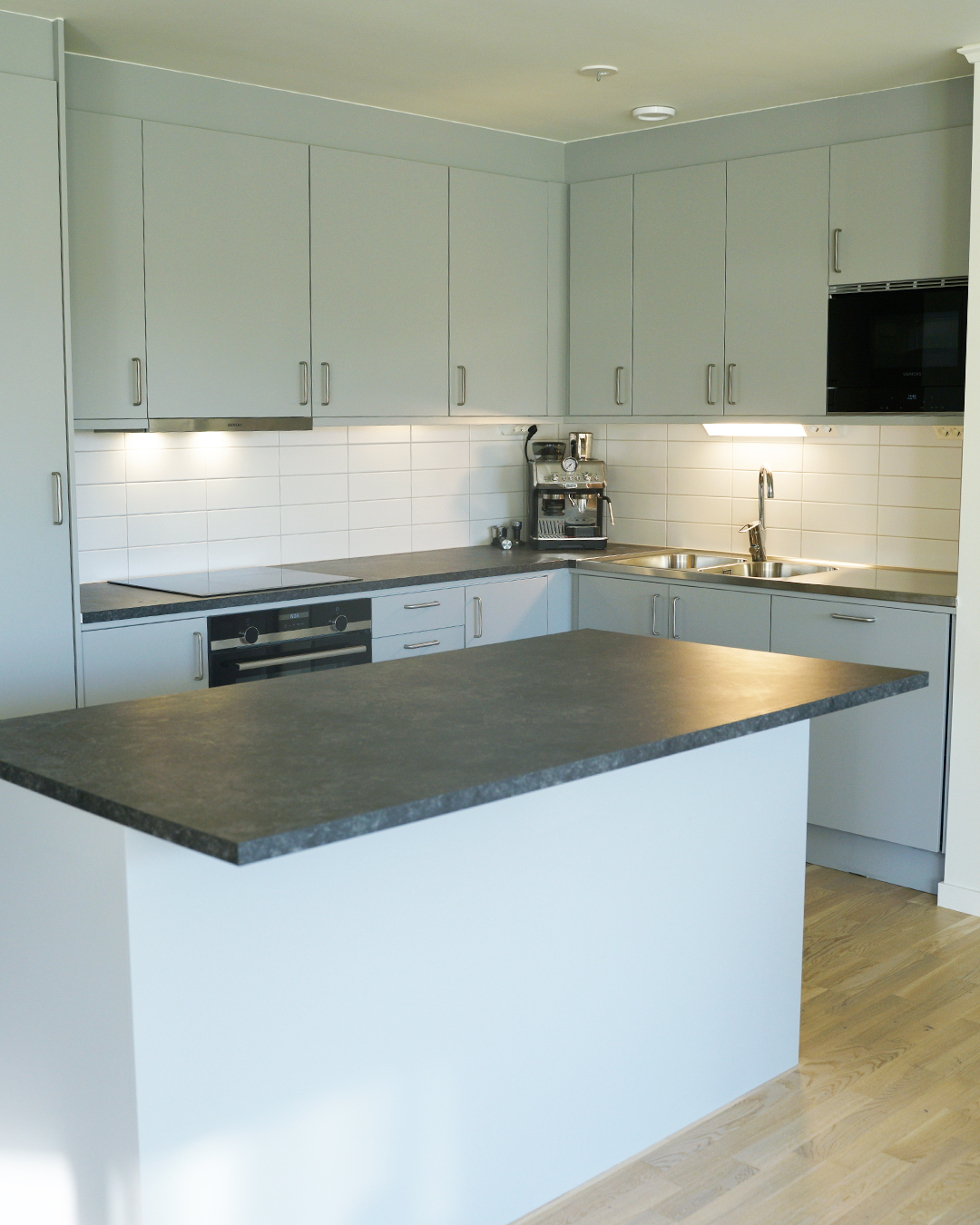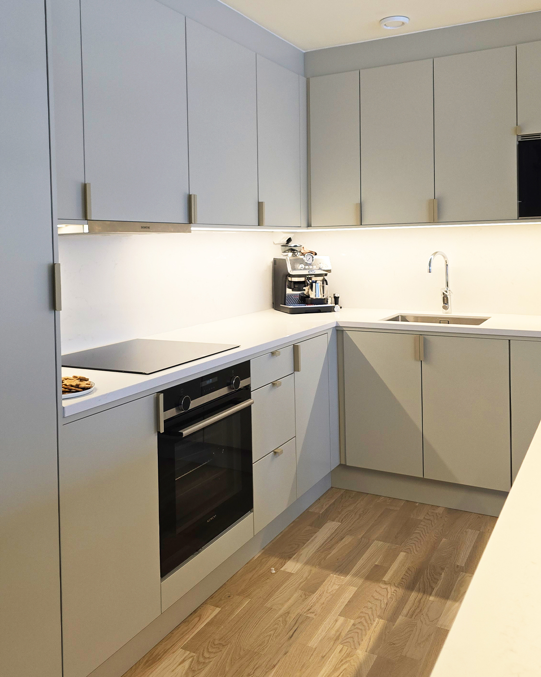 Emilia och hennes sambo har också lagt stor vikt vid att skapa ett funktionellt kök med smarta lösningar som gör det lätt att arbeta där. En särskild lösning de är mycket nöjda med är den infrästa ledbelysningen under överskåpen. Belysningen ger ett jämnt och behagligt ljus som sprider sig över hela arbetsytan och gör det lättare att arbeta i köket, samtidigt som det skapar en mysig atmosfär.