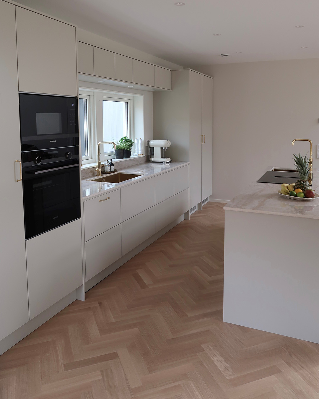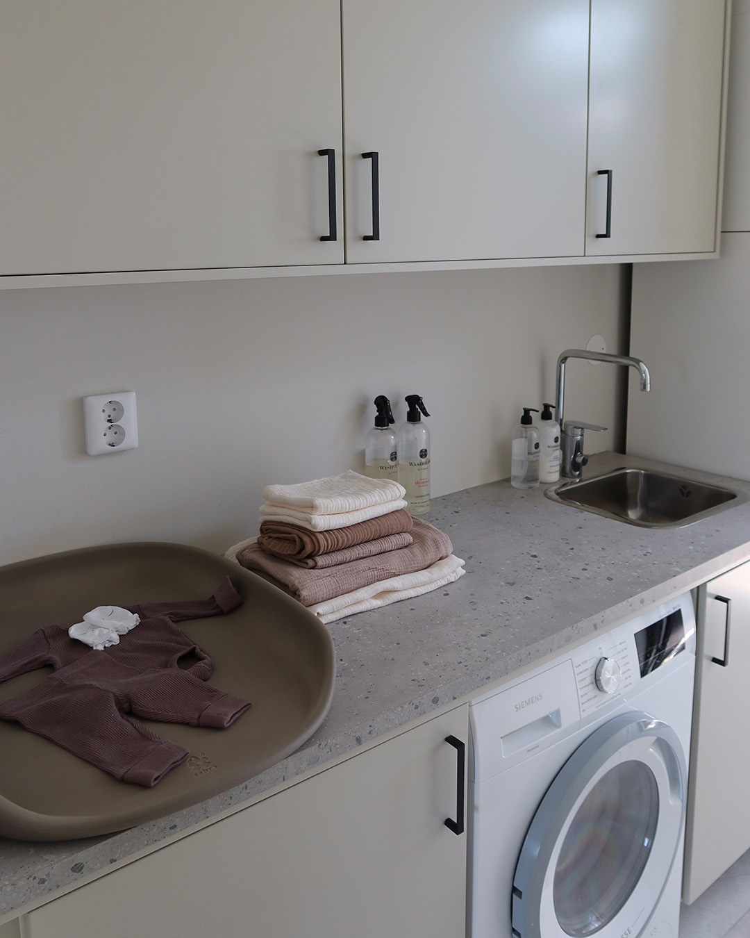 Inför renoveringen var det även viktigt att tvättstugan skulle gå i samma toner som köket, för att binda ihop hemmet på ett bättre sätt än tidigare då tvättstuga var vit. Därför valde de luckan Maja i kulören linnebeige även här, något de inte ångrar.
