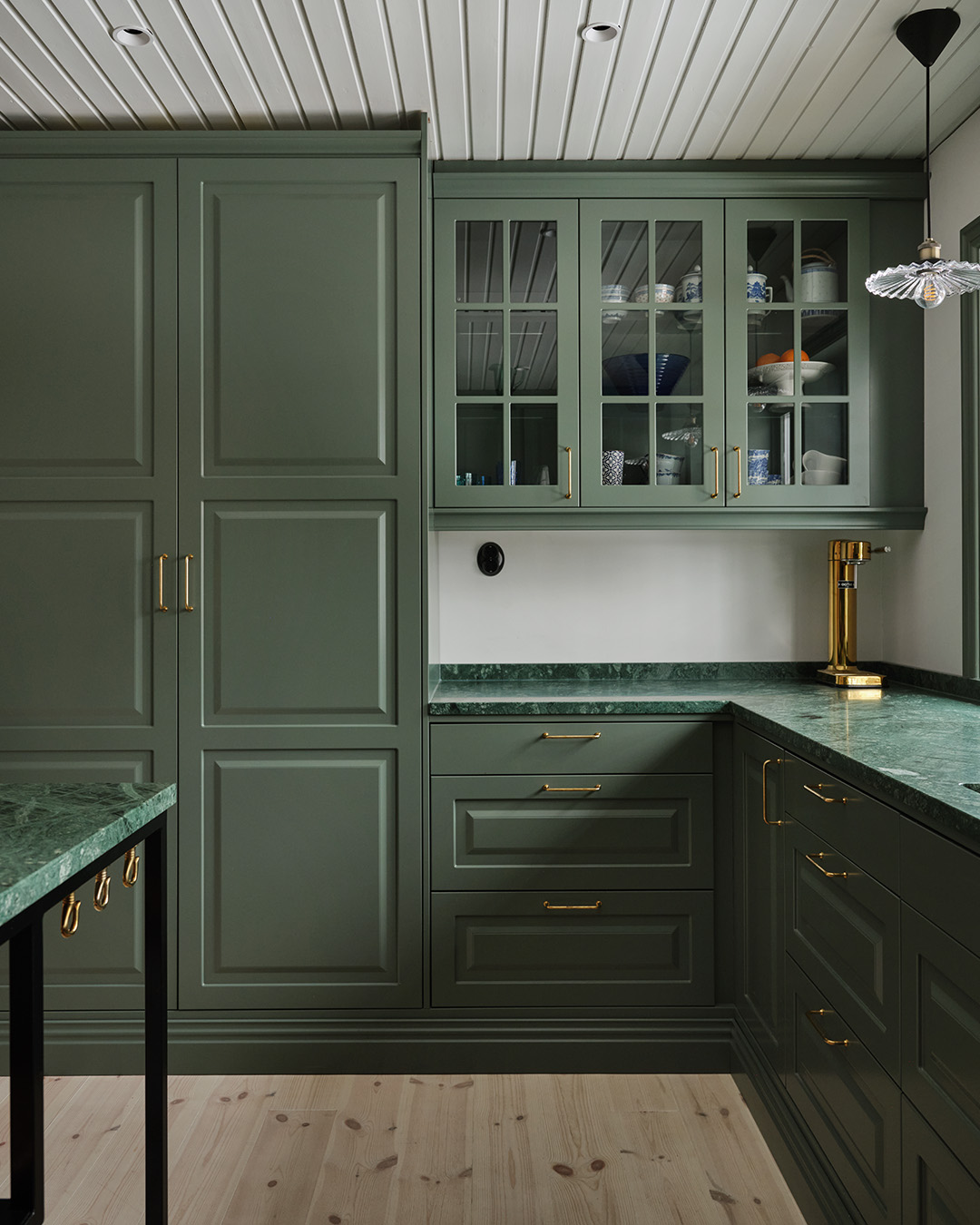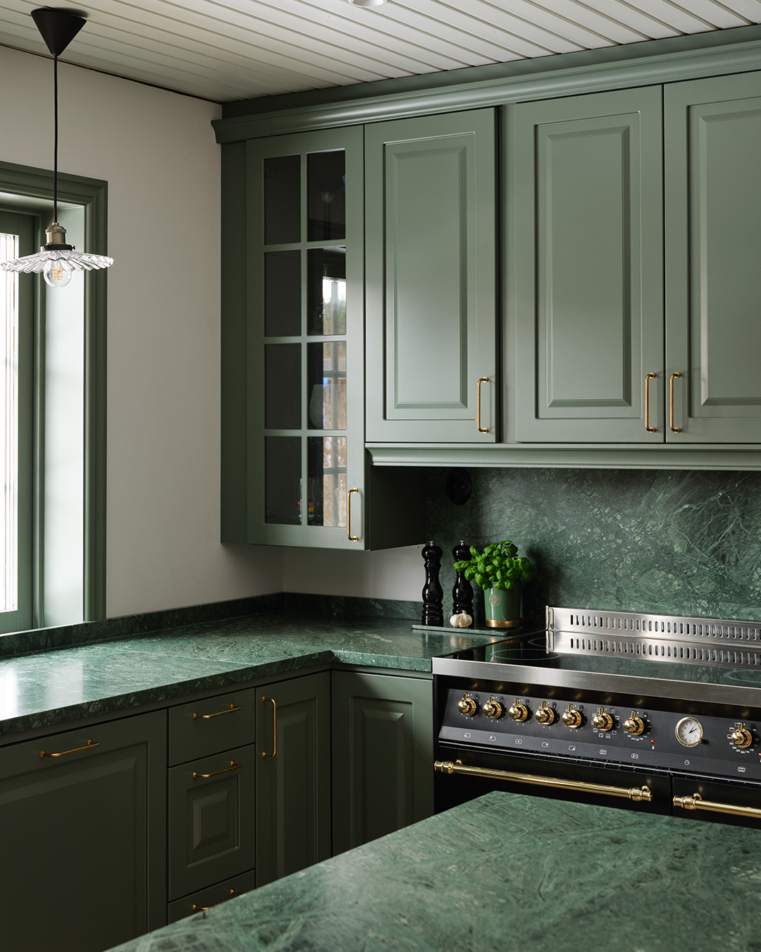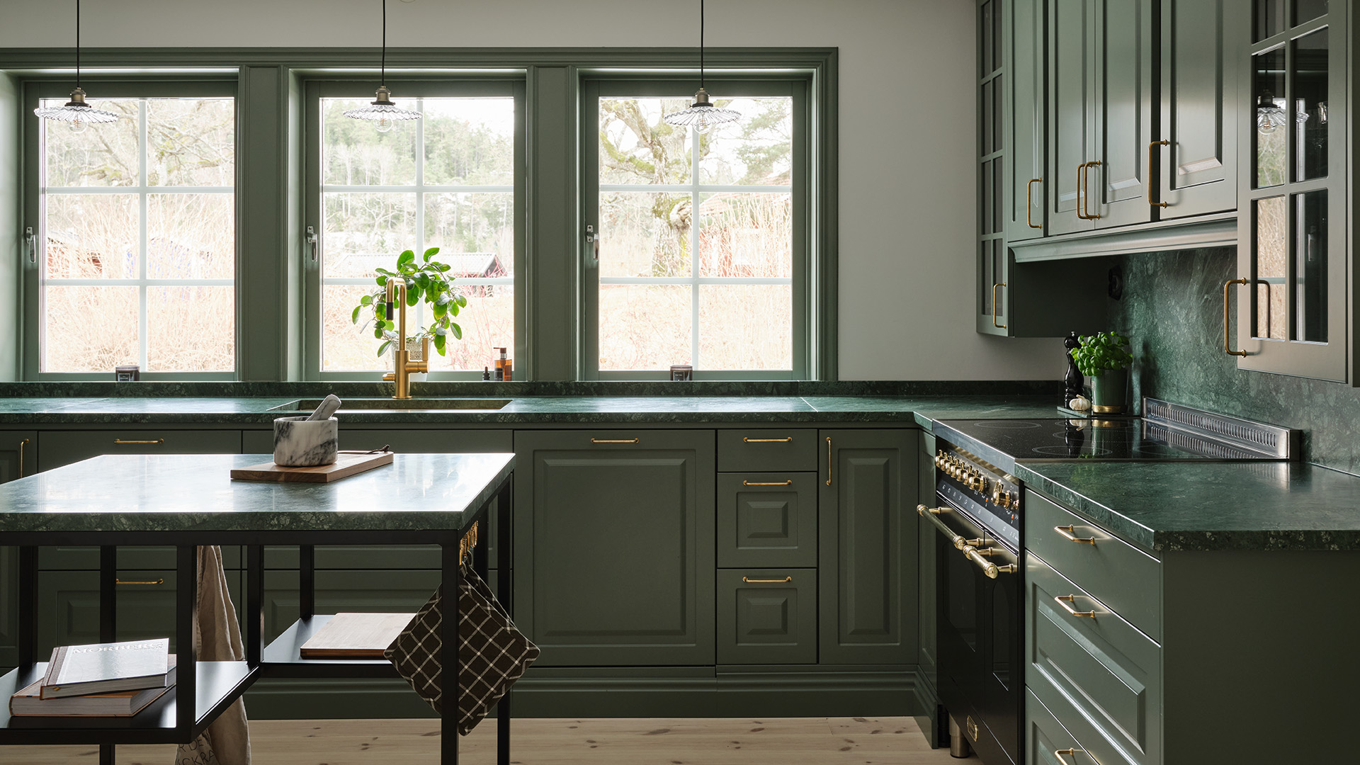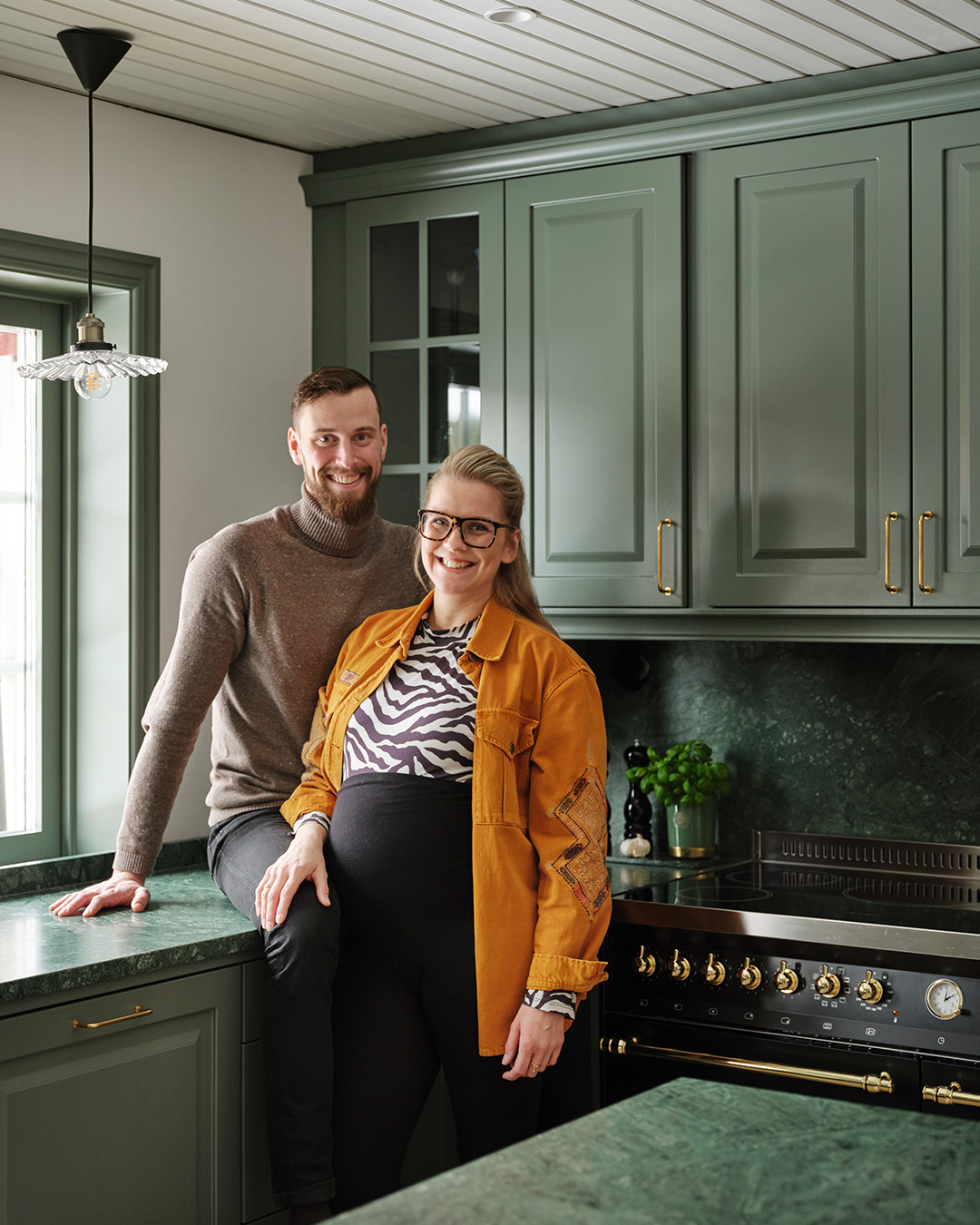 Ingen minns en fegis! Att våga kombinera en skogsgrön lucka med en grön bänkskiva i natursten är ett av Lotta Möller och sambon Viktor Mickelssons bästa köksbeslut. Den gröna kulören ger köket precis den varma och härliga känsla de ville ha.