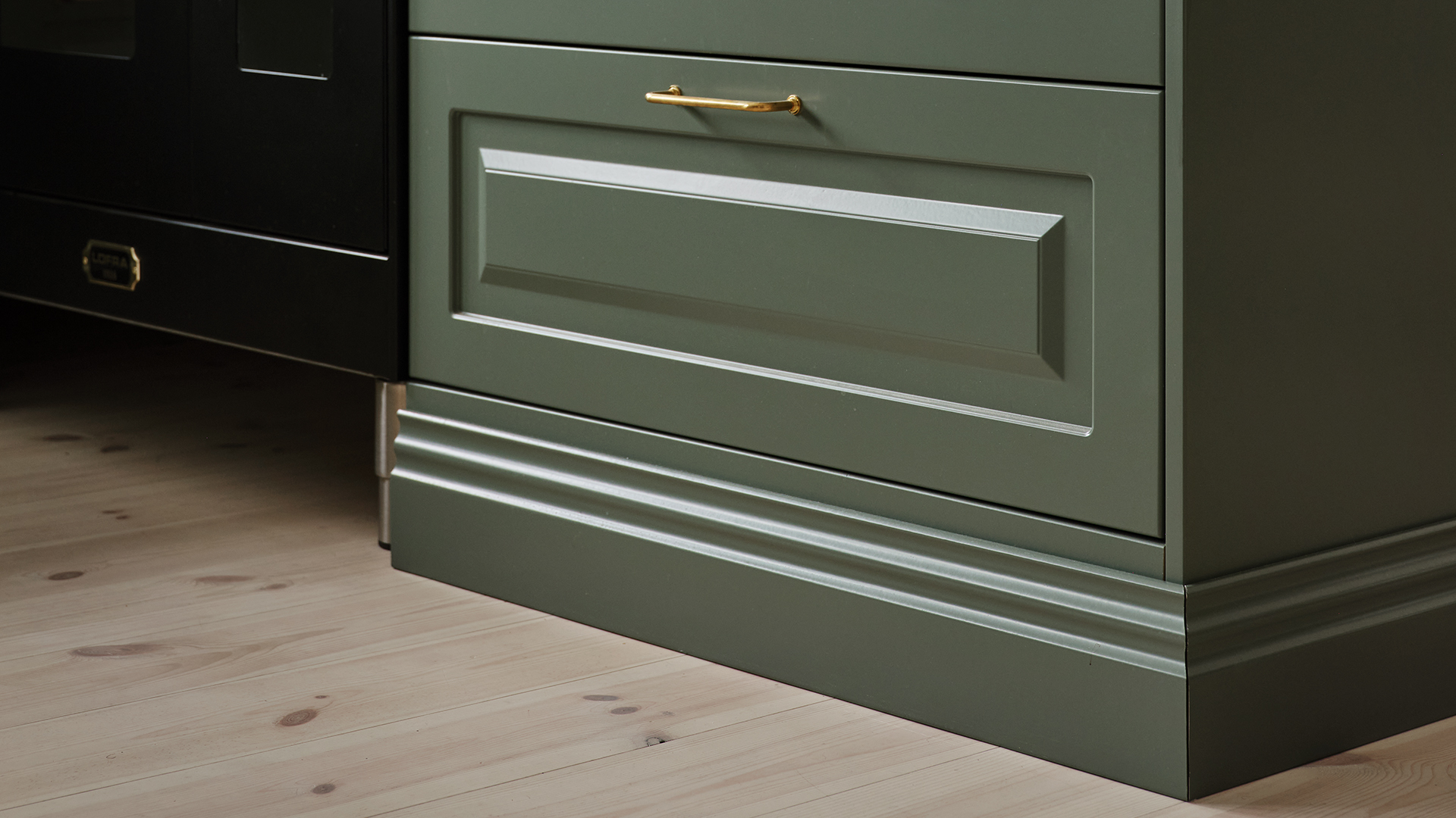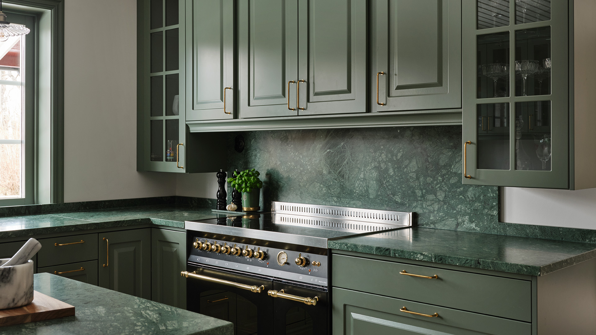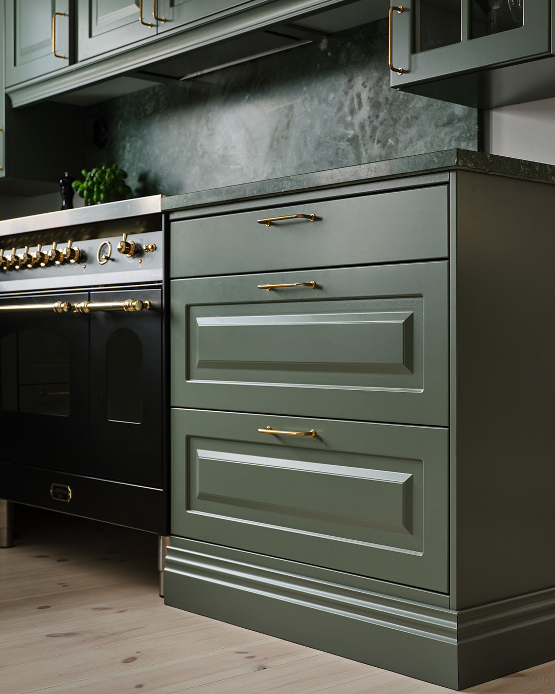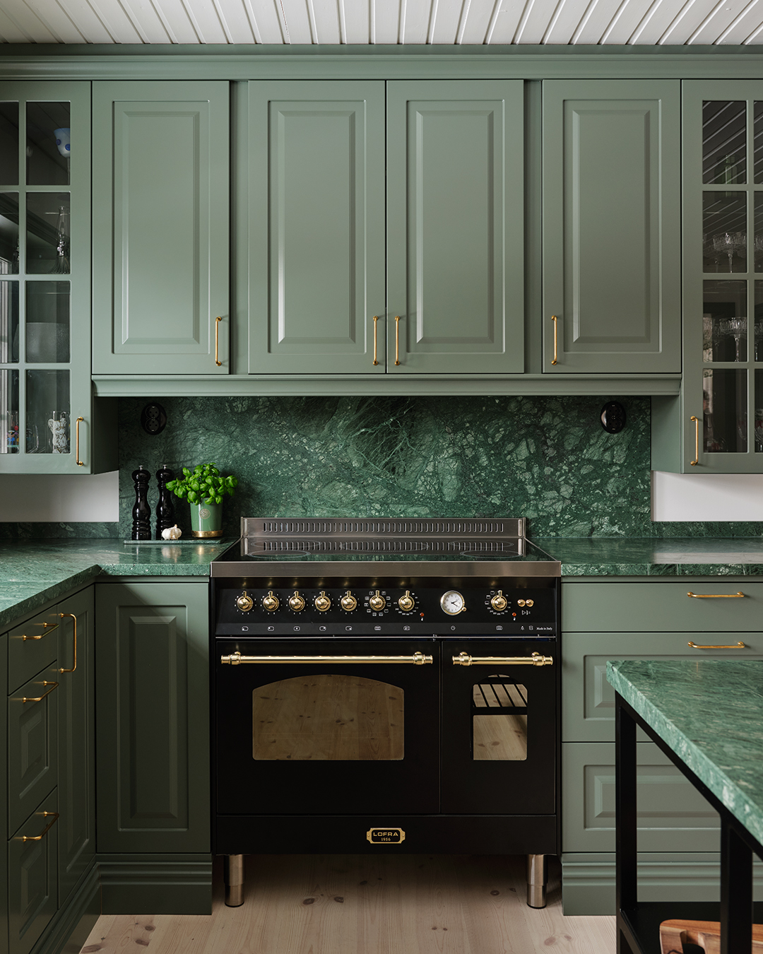 Ingen minns en fegis! Att våga kombinera en skogsgrön lucka med en grön bänkskiva i natursten är ett av Lotta Möller och sambon Viktor Mickelssons bästa köksbeslut. Den gröna kulören ger köket precis den varma och härliga känsla de ville ha.