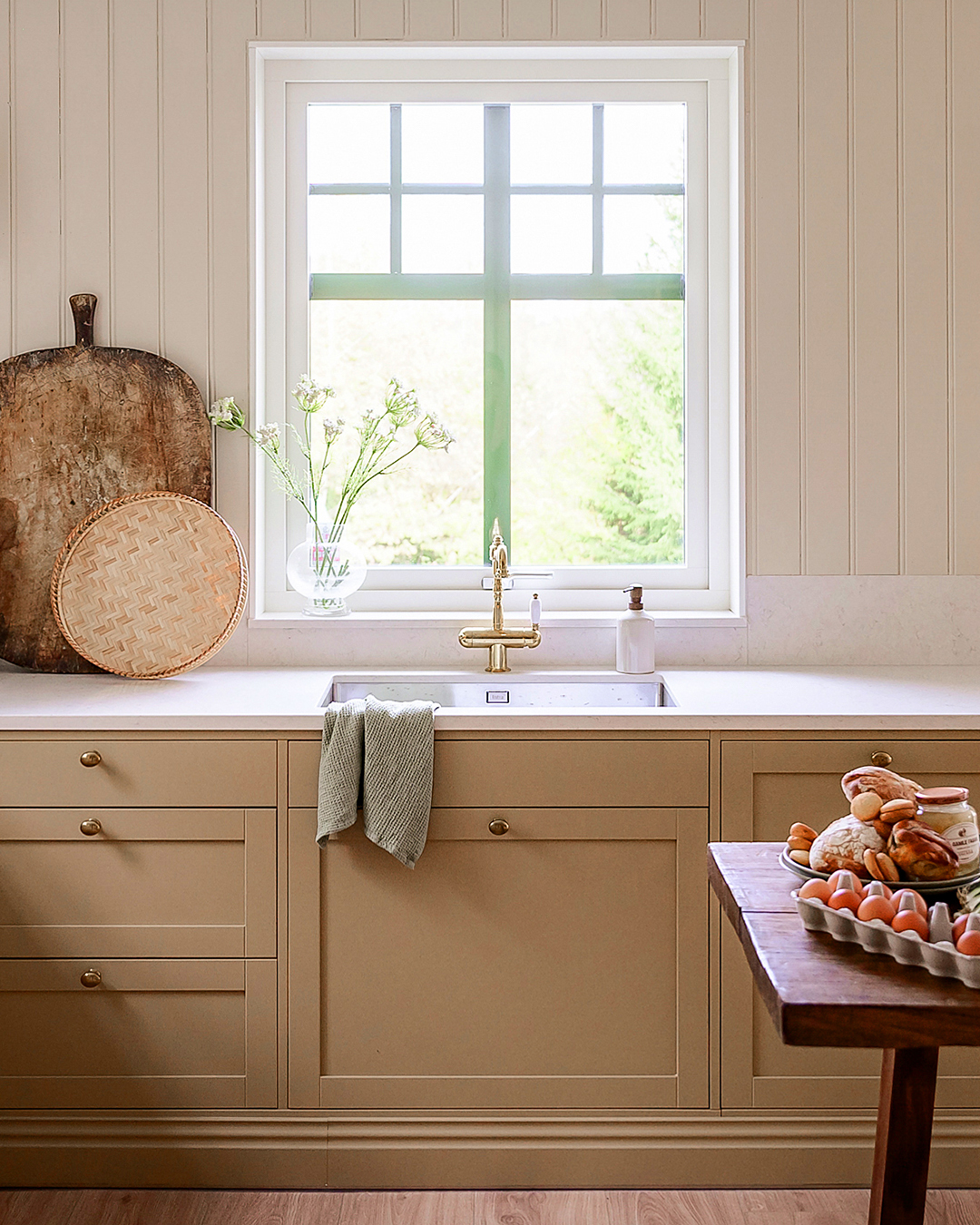 I Sätesgården har det lantliga köket fått stå i centrum. Med gula toner, pärlspont och antikmässing har Sandra Boart från Studiosextioett skapat ett hem fullt av värme och personlighet.