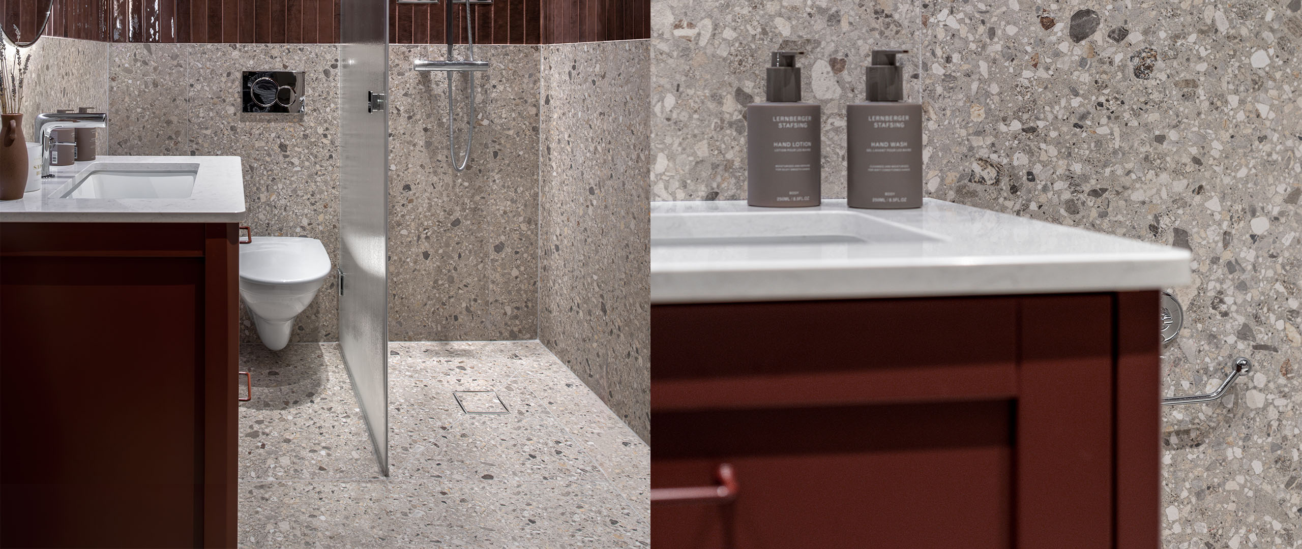 Resultatet? Ett badrum som blev precis som de hade tänkt sig. Sofie och hennes familj älskar sin nya oas, som blandar klassiska material med en modern twist. Kombinationen av terrazzogolv, kakel, och en kommod med topplatta av sten ger rummet både ett stilfullt och jordnära uttryck.