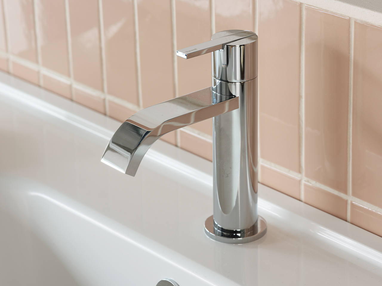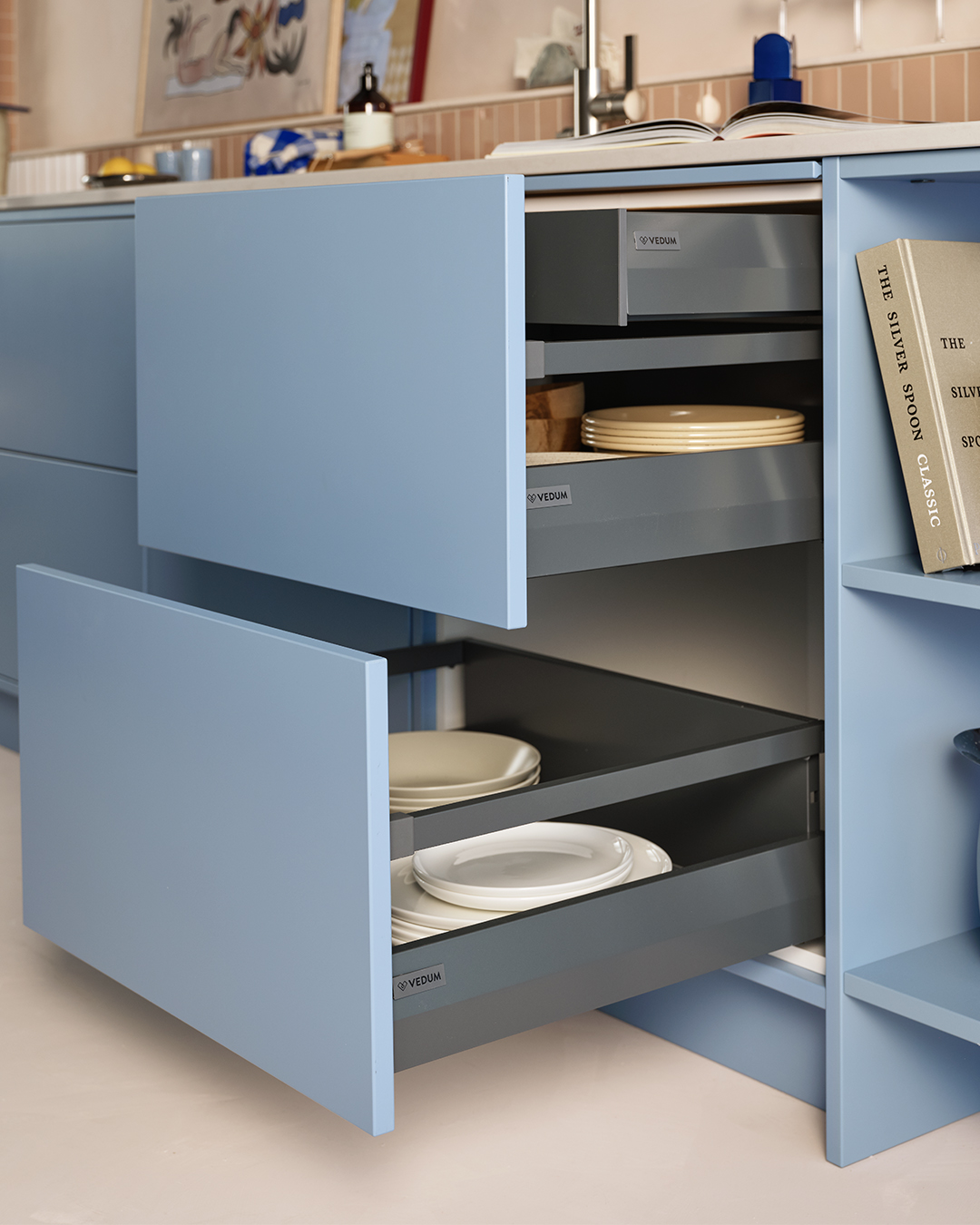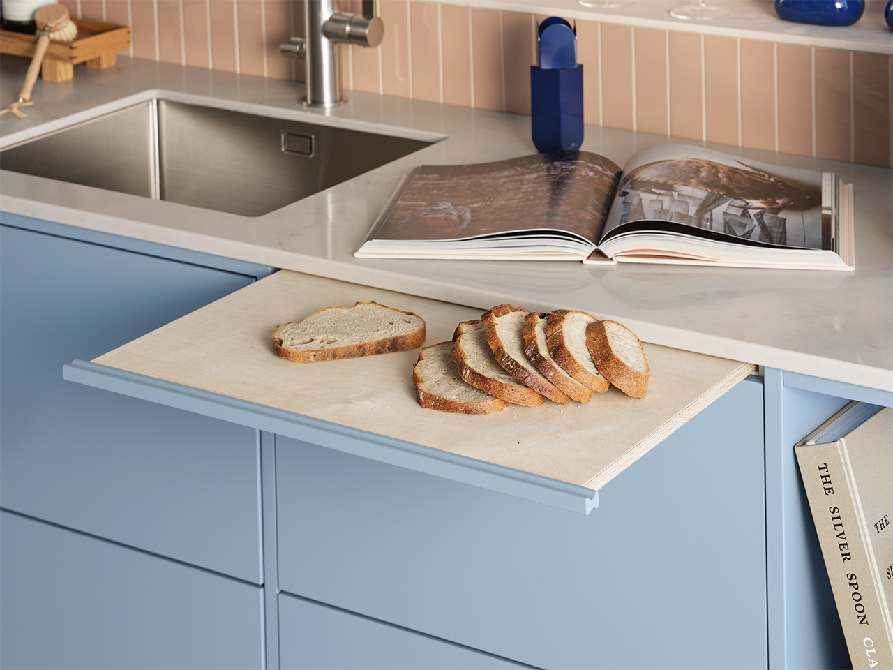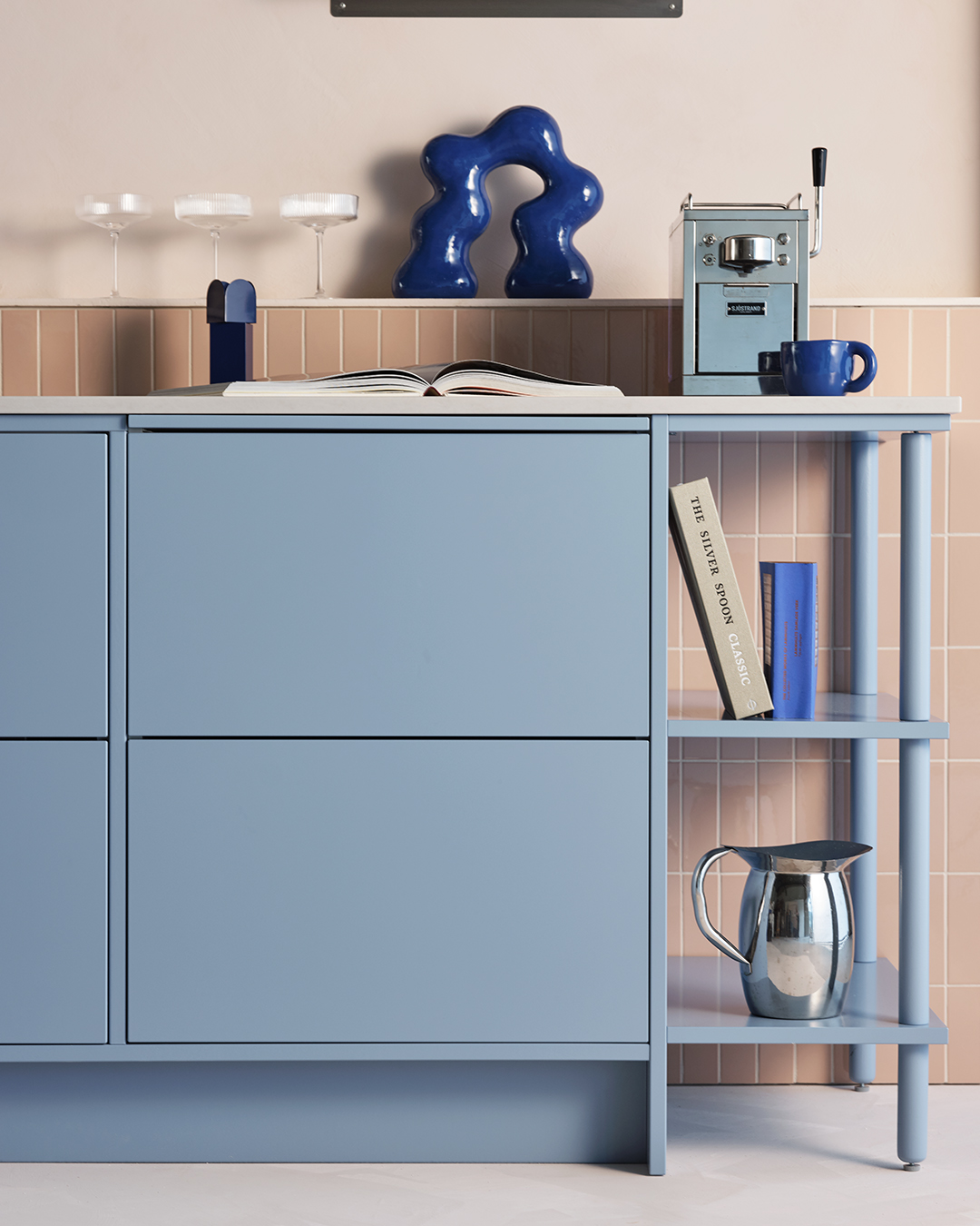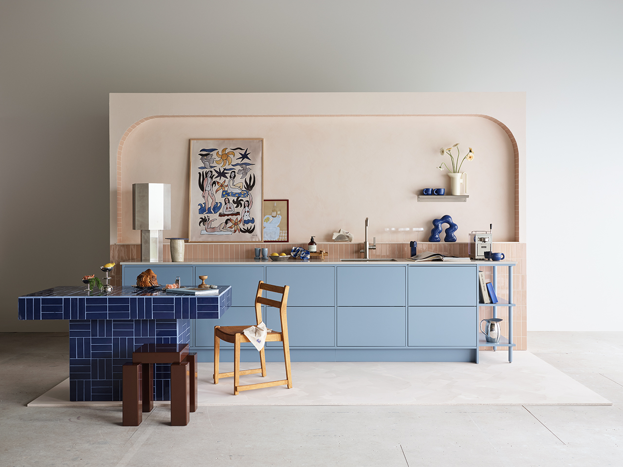 Duon har tagit fasta på det lekfulla och flörtiga för att ge den moderna stilen en lite mer mjuk och lättsam ton. Den djärva blå kulören och det milda, mättade persikofärgade kaklet är båda starka personligheter som gifter sig fint i en balanserad, harmonisk övergång. Den rundade formen i valvet ger ett vänligt och välkomnande intryck, ramar in miljön och bildar också en vacker display-yta för personliga föremål. Ett modernt kök som känns varmt och avslappnat.