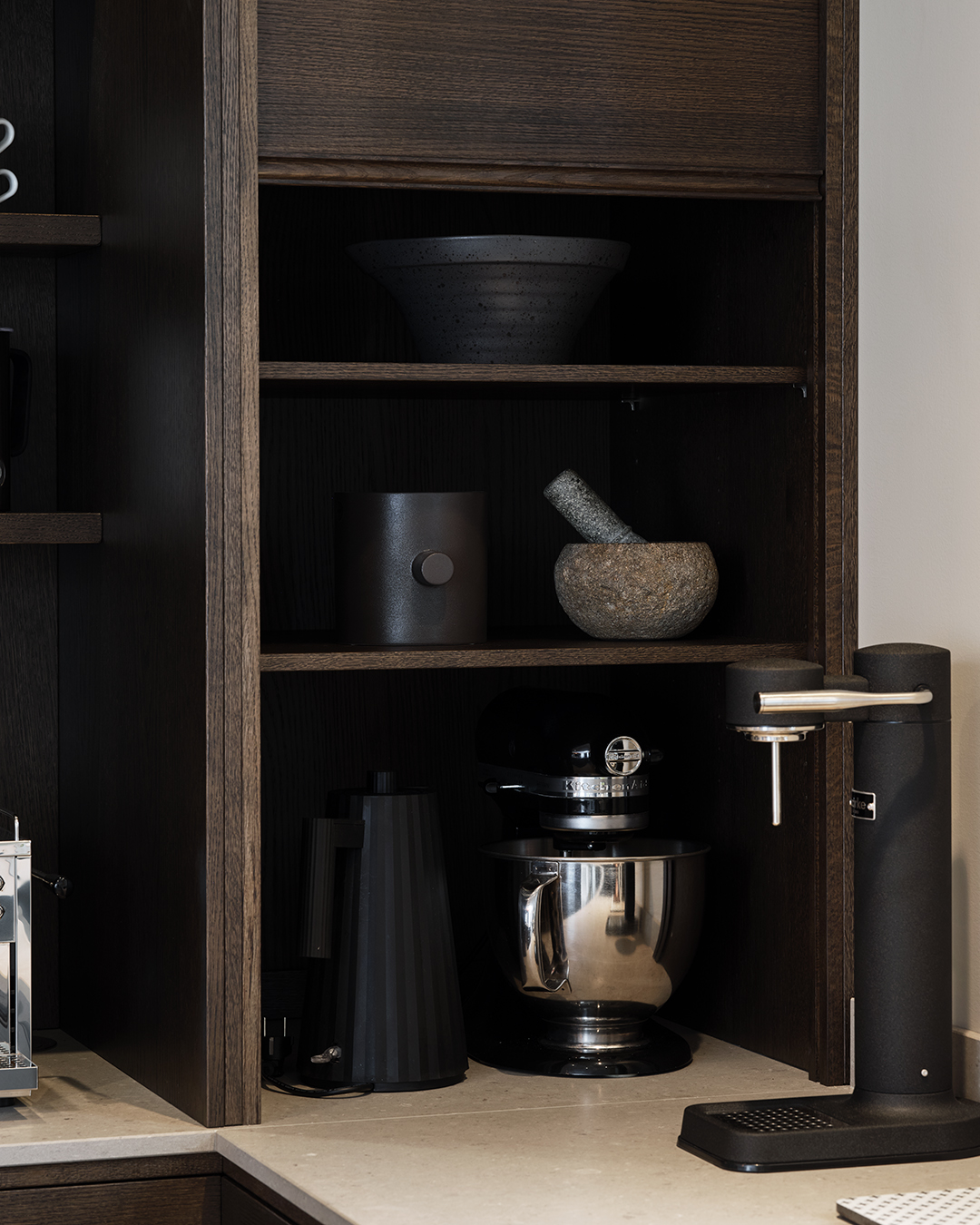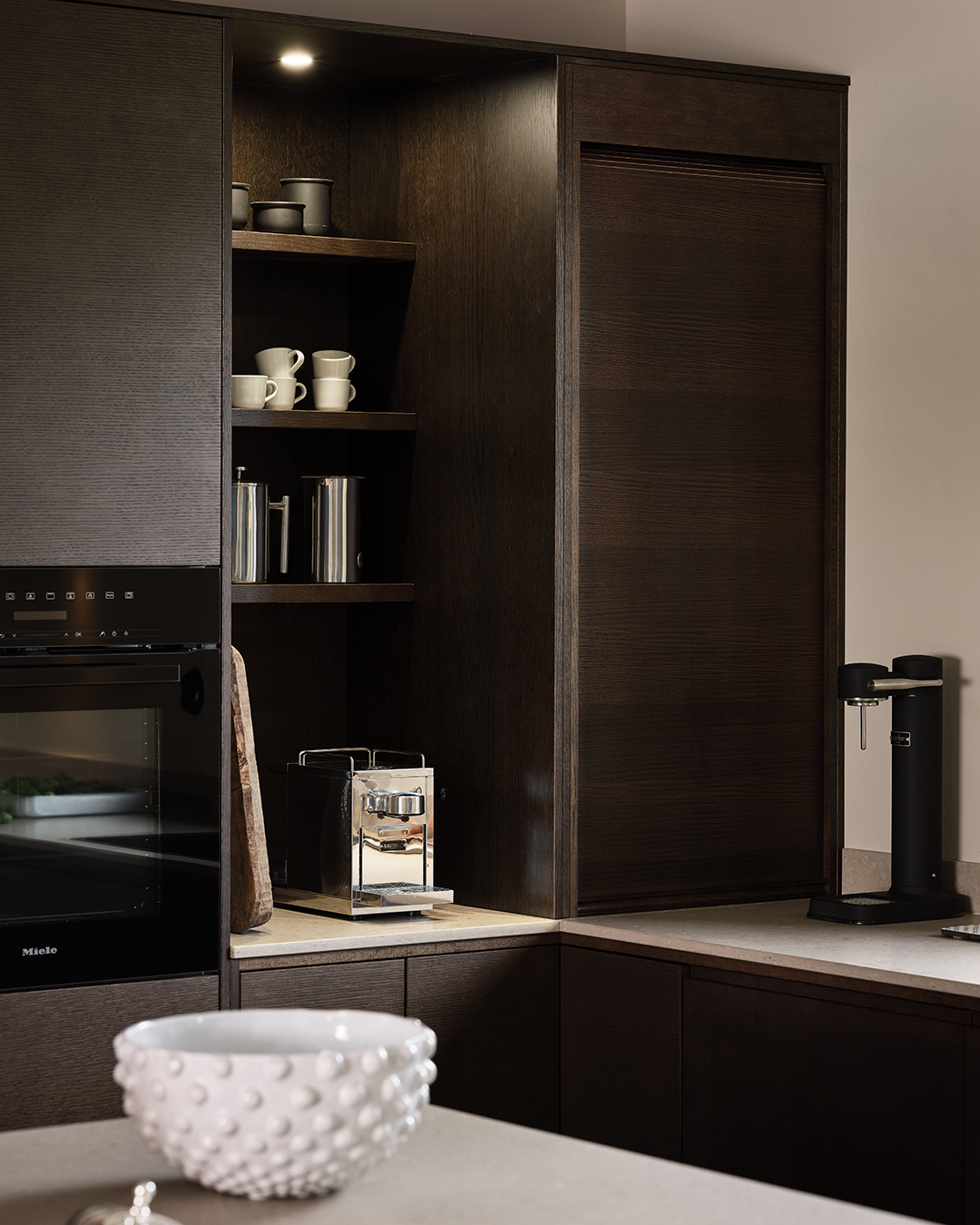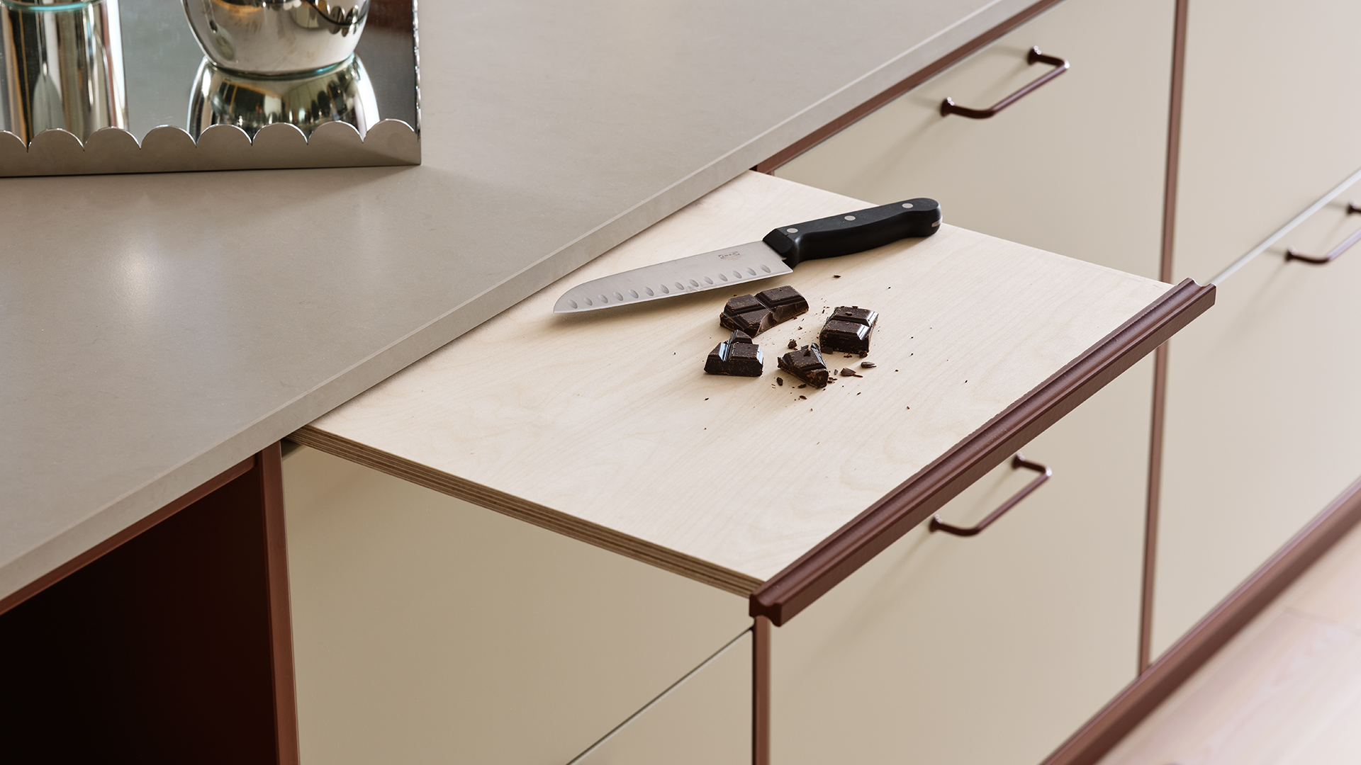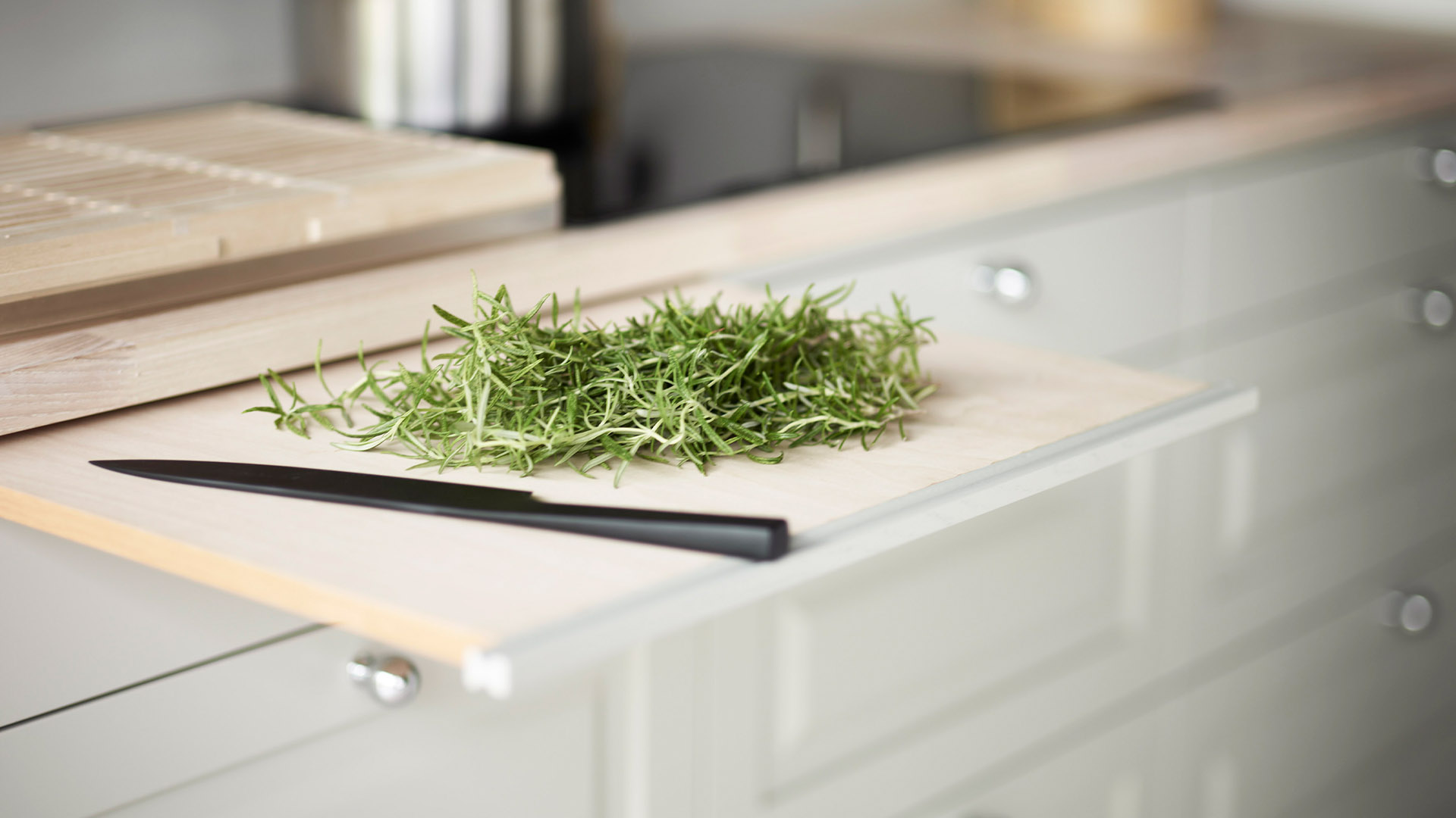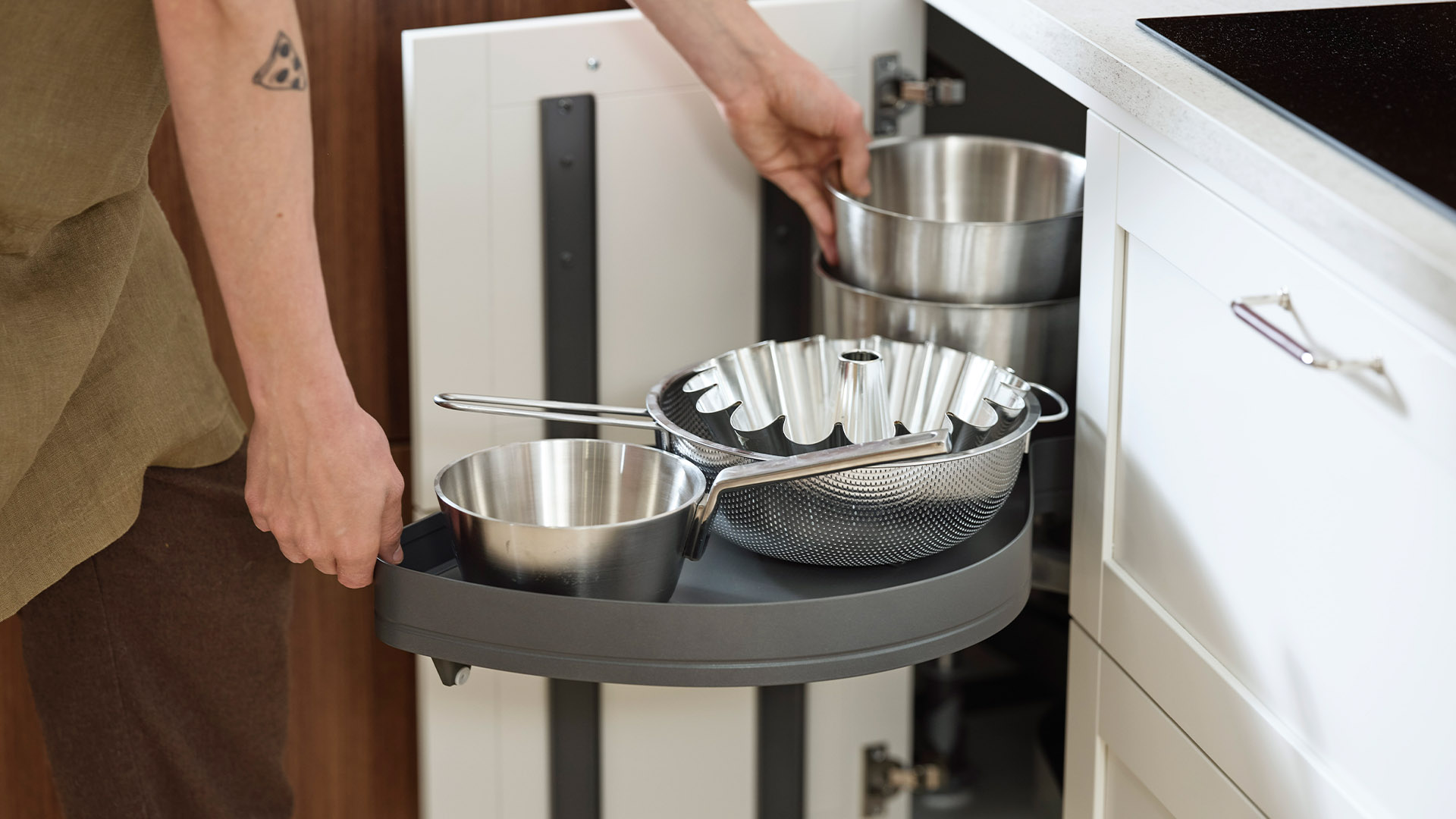 – Inget kök är det andra likt! Finns det en ”knivnörd” i familjen måste man tänka till vad gäller förvaring av kockknivarna. Den bakintresserade kanske vill få in förvaring för ett bakbord någonstans. I de flesta kök blir det över ytor med lite svåra mått, någon decimeter bara. När jag ritar kök är det självklart att jag försöker nyttja varje millimeter. Då brukar jag exempelvis passa på att nyttja dessa ytor för utdragbara smala skåp där flaskor med olja, vinäger och kryddor får plats! Det viktigaste när man planerar sitt kök är funktionalitet och bra ytor för socialt umgänge. I min värld är det faktiskt viktigare än det estetiska, för det är det som avgör hur stor användning du har för ditt kök, säger Lisbeth Fogel, köksinredare på Vedum.