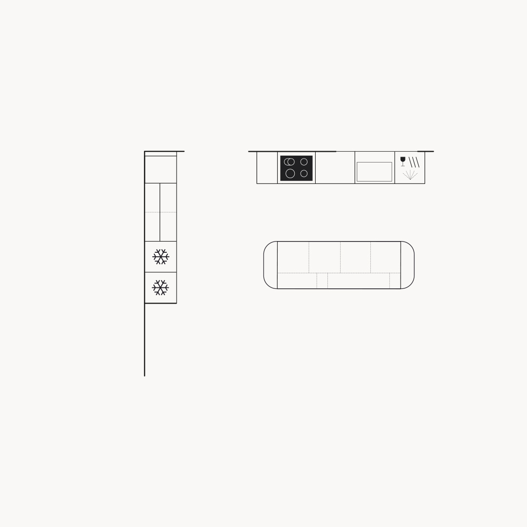 Högt i tak med generösa ytor och ramluckan Edit i kulören dimgrön. Köket har ett klassiskt uttryck med moderna inslag – ramluckans lite smalare ram, distinkta detaljer i svart, öppen förvaring i vitpigmenterad ek och lätt rundad köksö. Den framdragna sockeln med allmogeprofil skapar en platsbyggd känsla och vitrinskåpen blir ett fint blickfång.