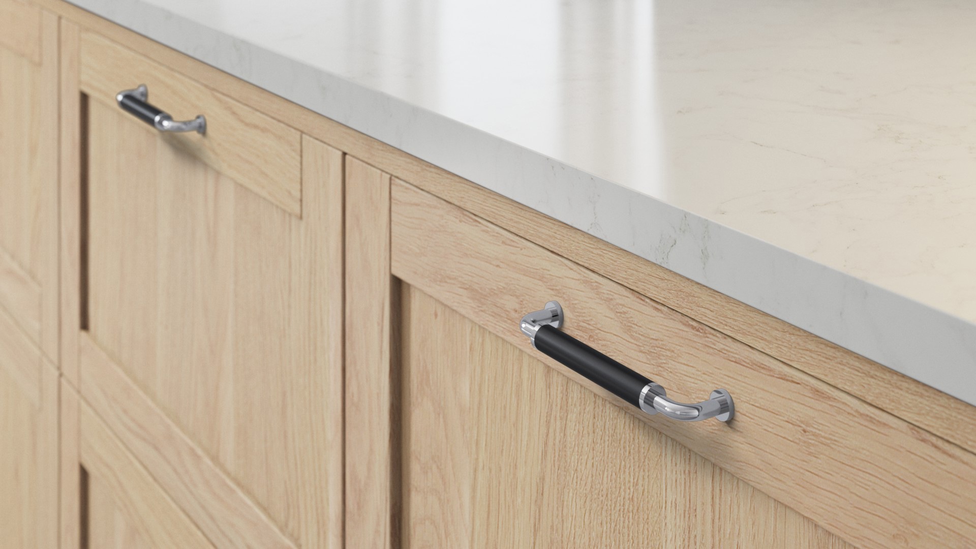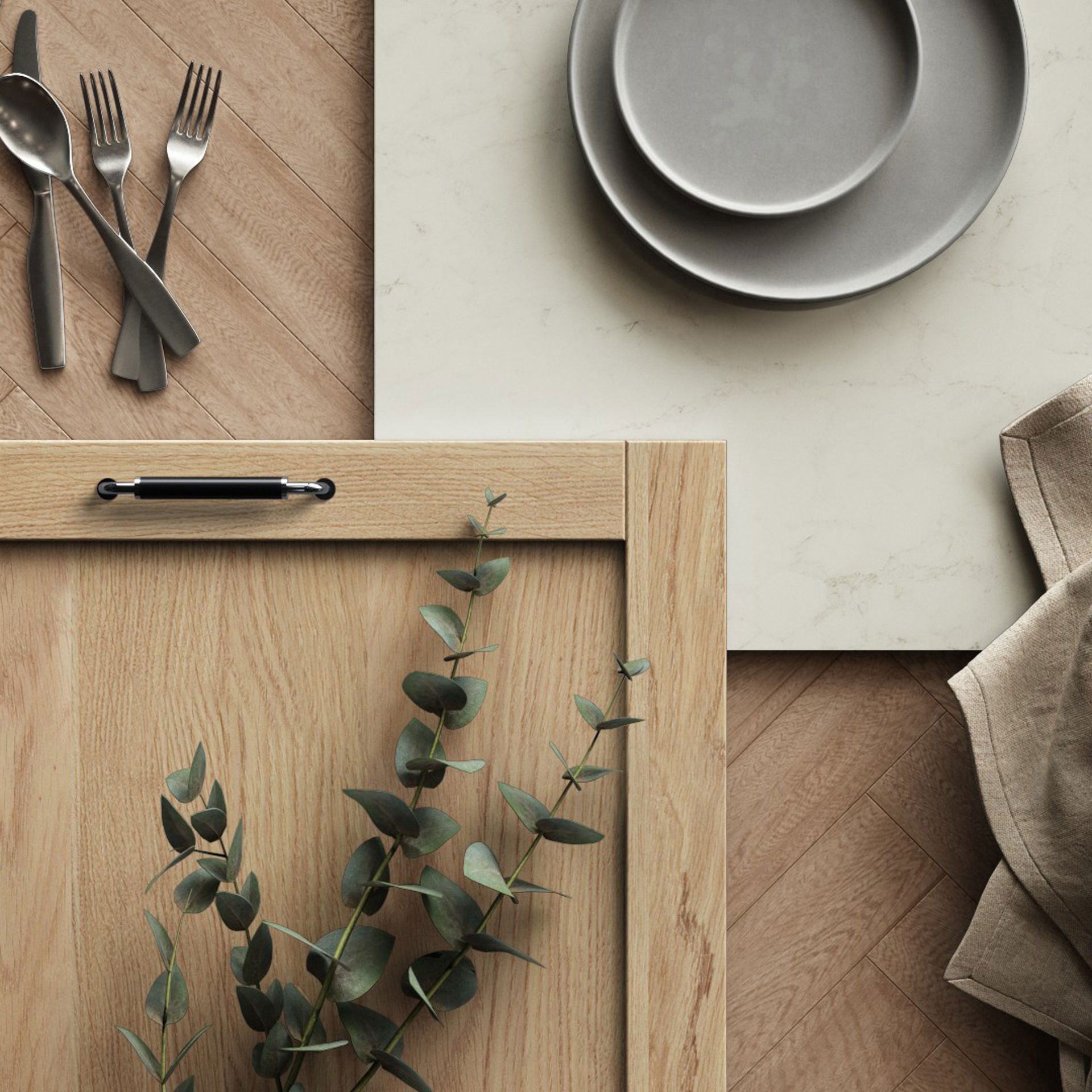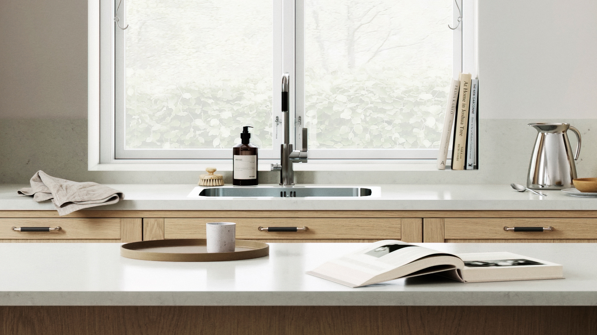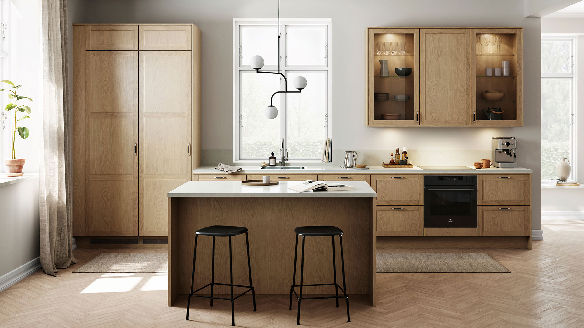 Ljus natur i ett kök med mycket träkänsla och eleganta linjer.