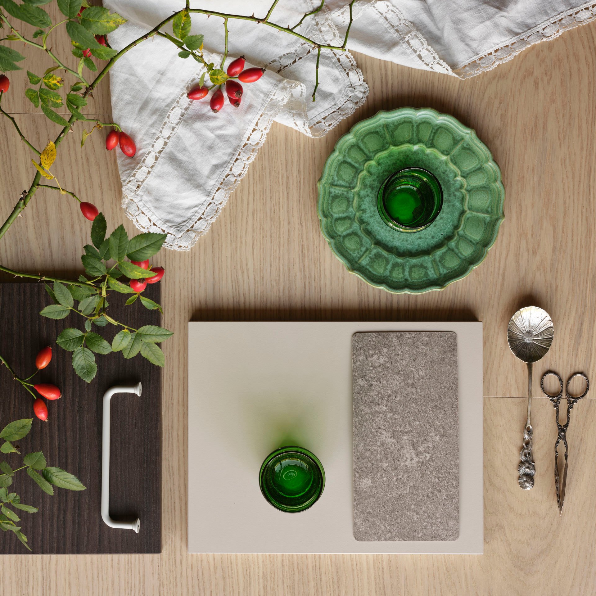 I det här moderna köket har vi skapat en varm och trivsam miljö med älskade, vackra gamla ting, växter och matchande gröna detaljer. Den nya Svanenmärkta melaminluckan Ilse beige och Ilse brun ek förstärker den mjuka och naturliga känslan. Två bänkvitrinvitrinskåp ramar in helheten och ger plats att visa upp det du tycker om. Ett praktiskt och enkelt kök som är både tidlöst och hållbart.
