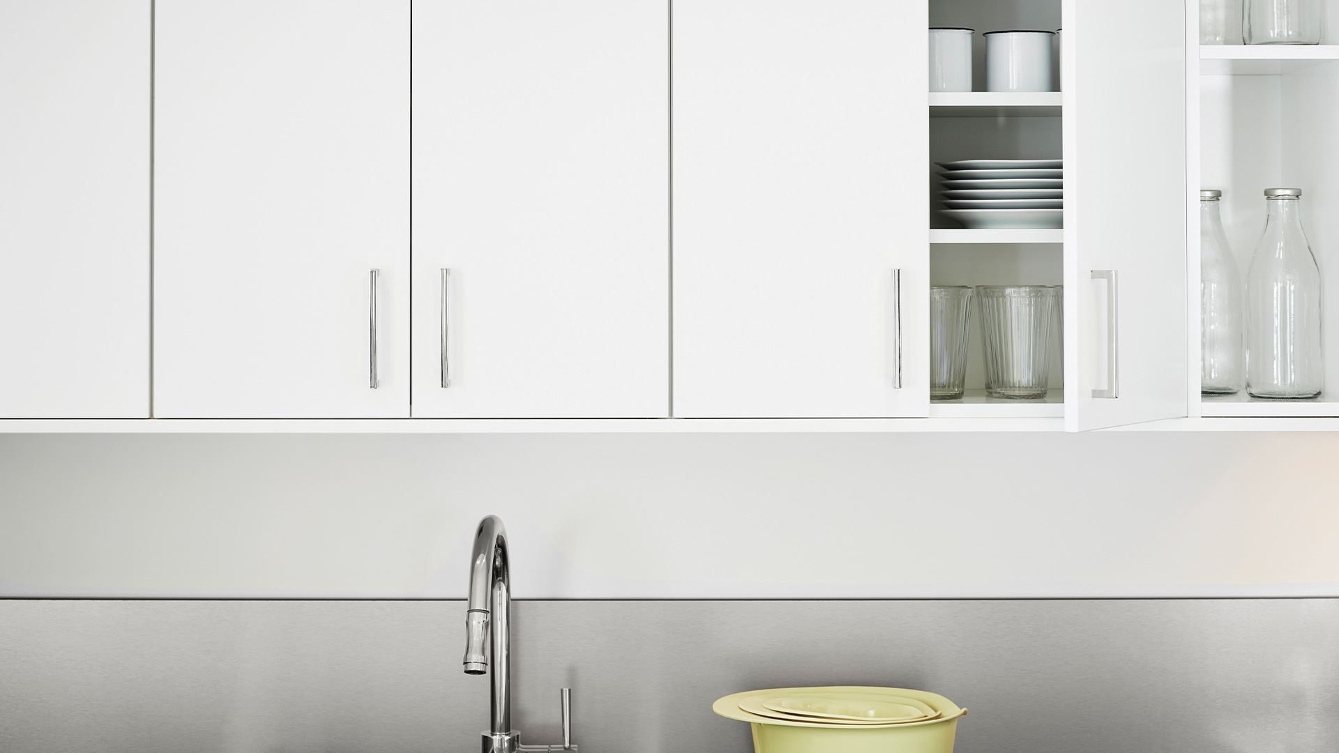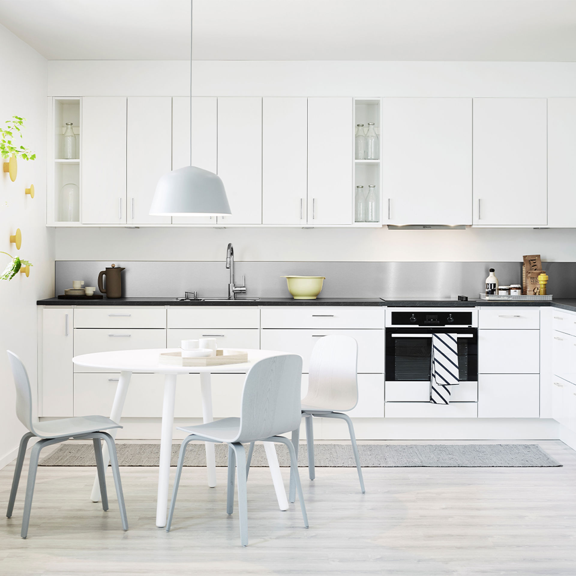 För dig som vill ha ett stilrent vitt kök med personliga inslag. Här har vi kombinerat enkla linjer med detaljer som stänkpanel, handtag och blandare i krom. Ett ljust kök som känns fräscht och neutralt med öppen och dold förvaring.