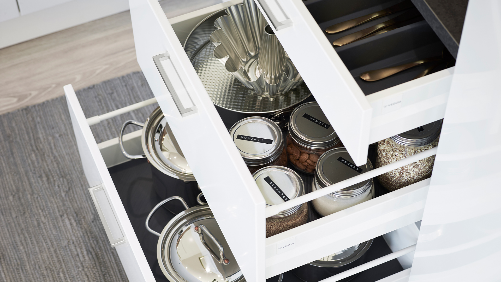 Ett stilrent neutralt kök med fräscha detaljer i krom.