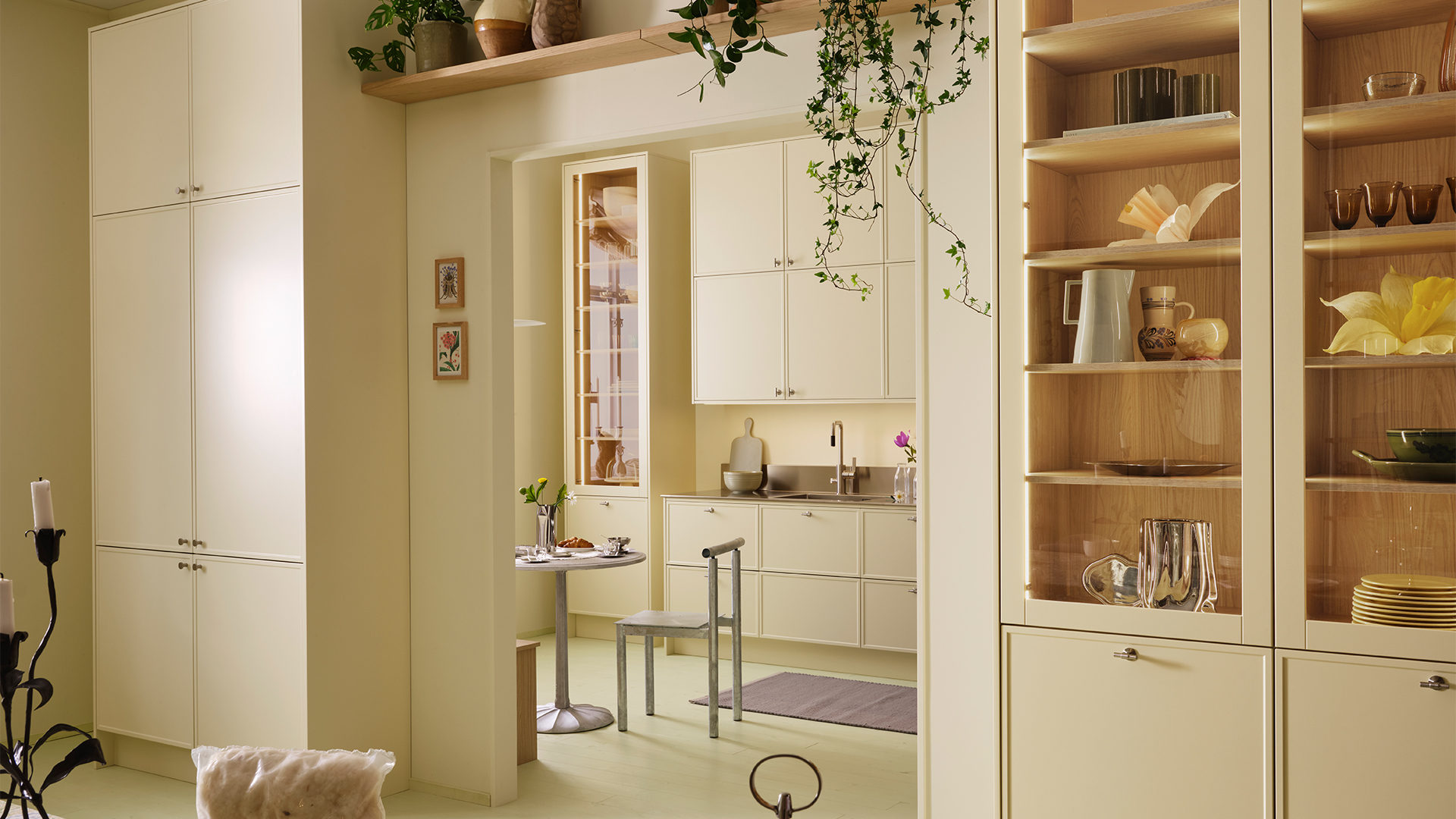 Vår nya kulör cremegul får det här solkyssta köket att stråla som i ett varmt morgonljus. Den nya luckan Thea med en smal, elegant ram skapar ett stilrent, arkitektoniskt uttryck. Materialmötet mellan rostfri diskbänk och vitpigmenterad ek inuti vitrinskåpen ger liv åt miljön. Ett soligt, fjäderlätt kök som andas både retro och framtid.