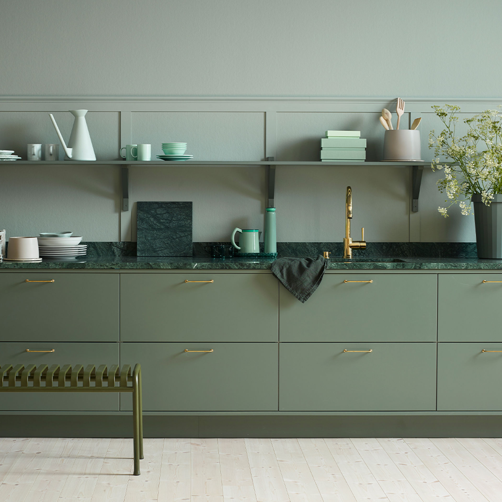 Kulören skogsgrön är inspirerad av skandinaviska barrskogar och skapar en naturligt lugn känsla som gör att lungorna fylls av syre. Den dova gröna tonen kommer med lite jordig svärta och är precis som barrskogen lika vacker året om. Skogsgrön passar dig som vill skapa ett stilrent och samtidigt varmt uttryck som kan kombineras med både trärena och täckmålade ytor.